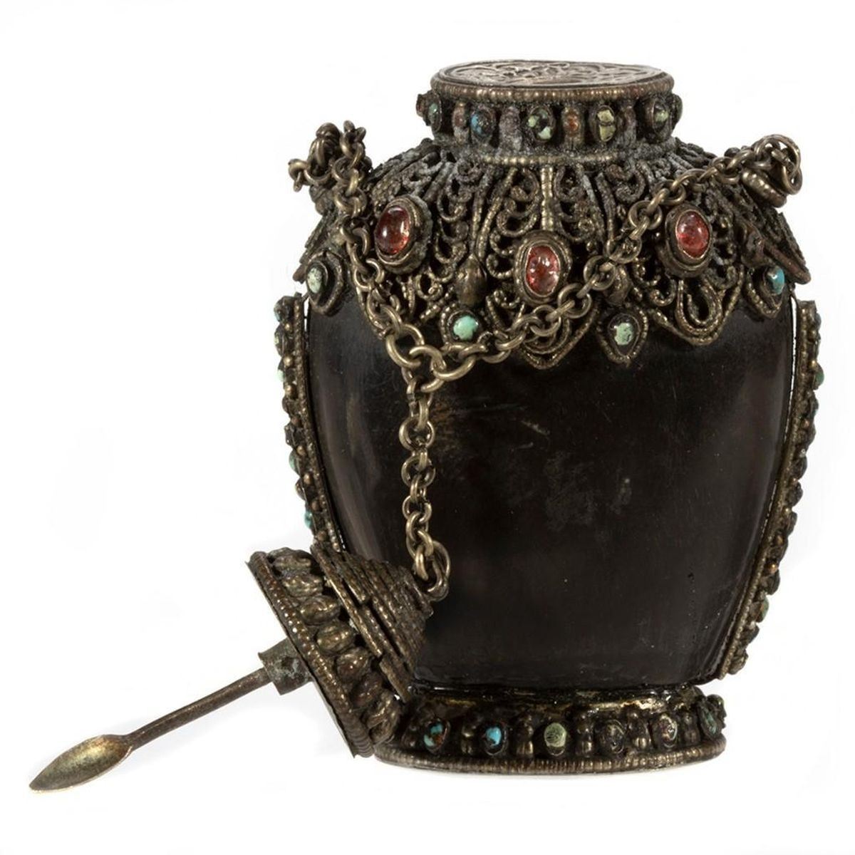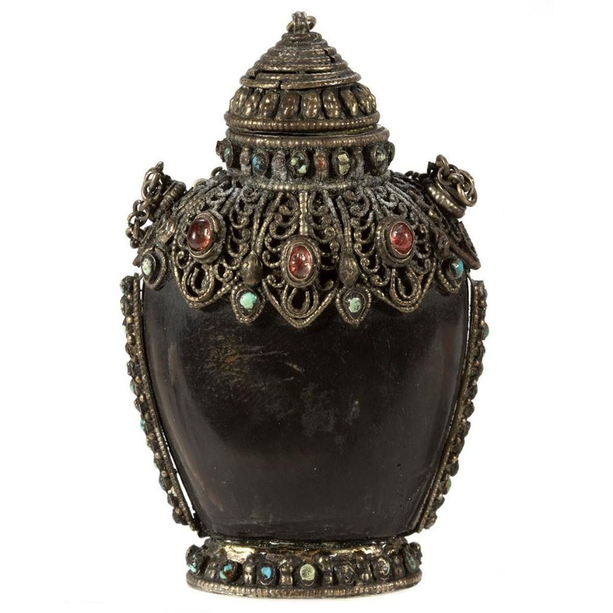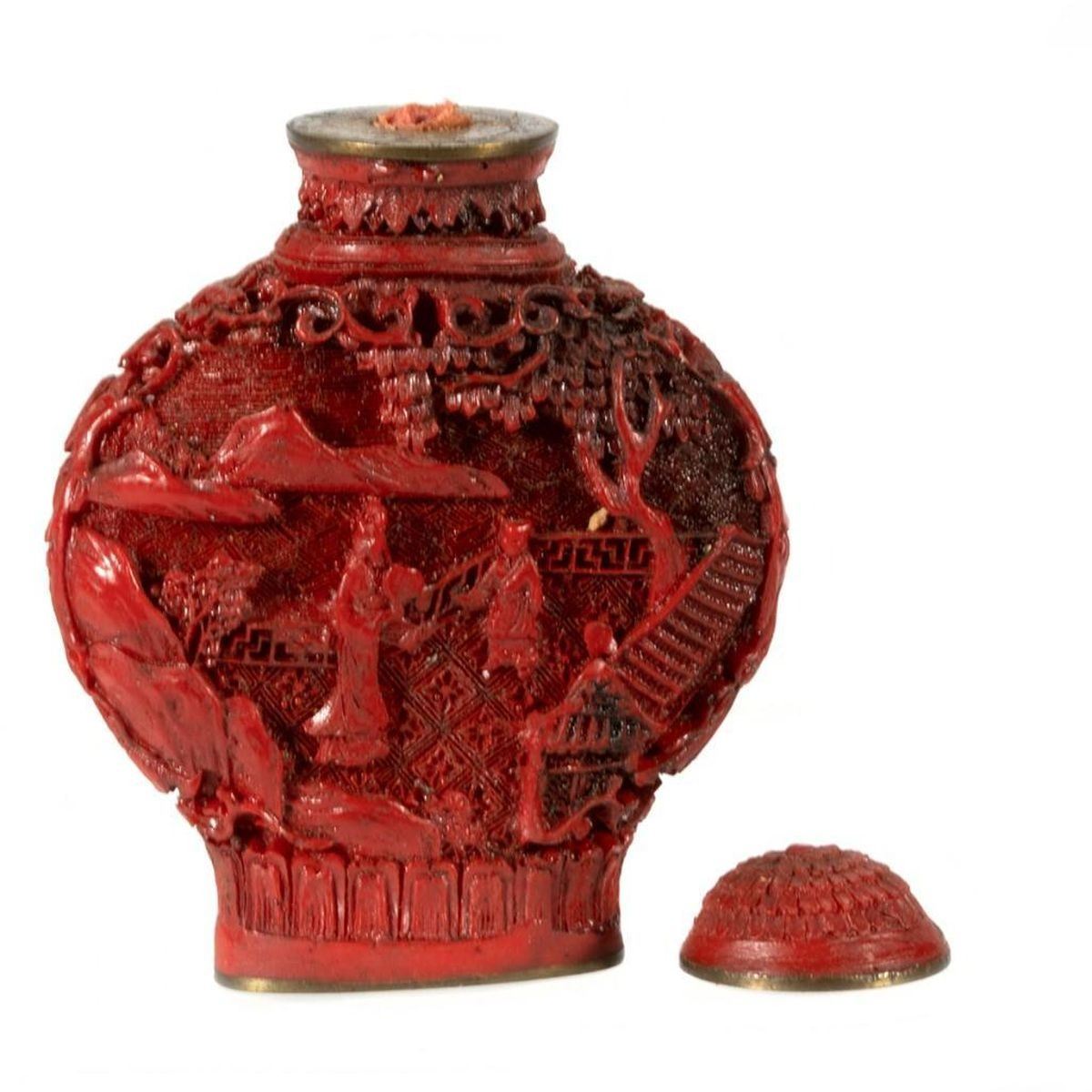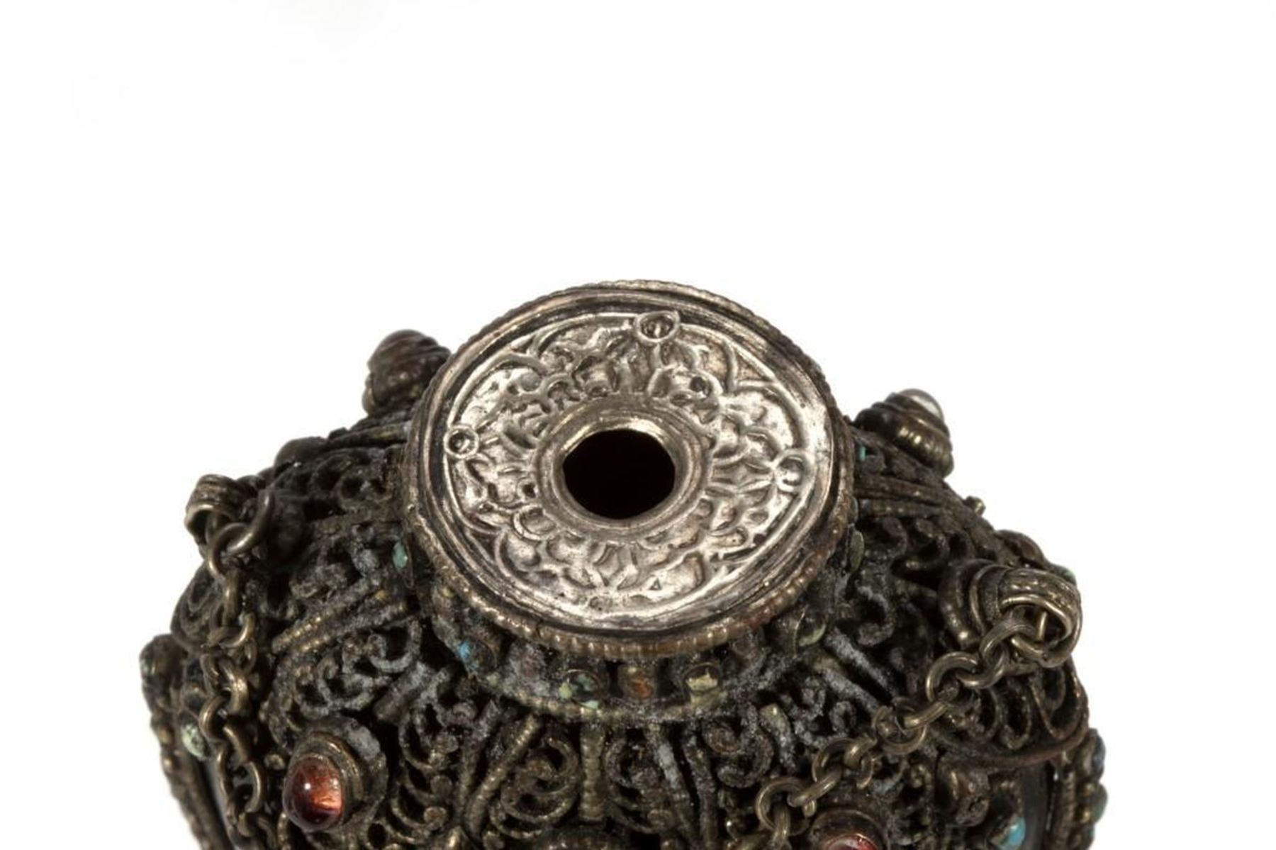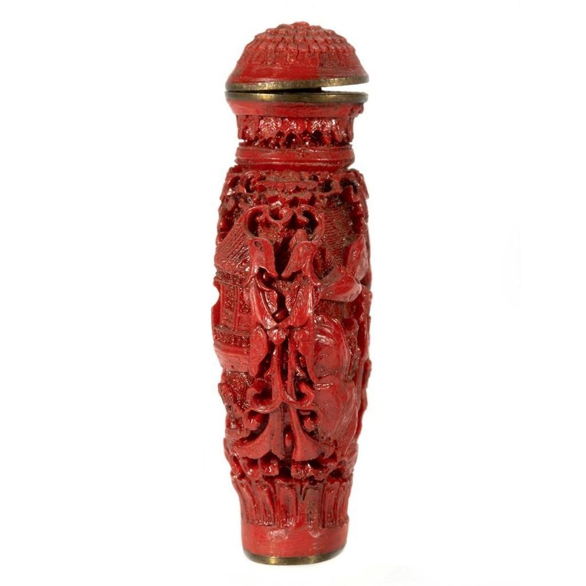 The first of carved cinnabar, the second (perhaps Tibetan) set with 'jewels.' Greatest height: 3 1/4in. Condition: One lacking stem.