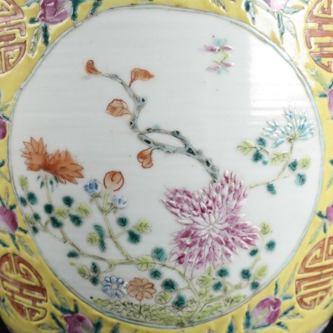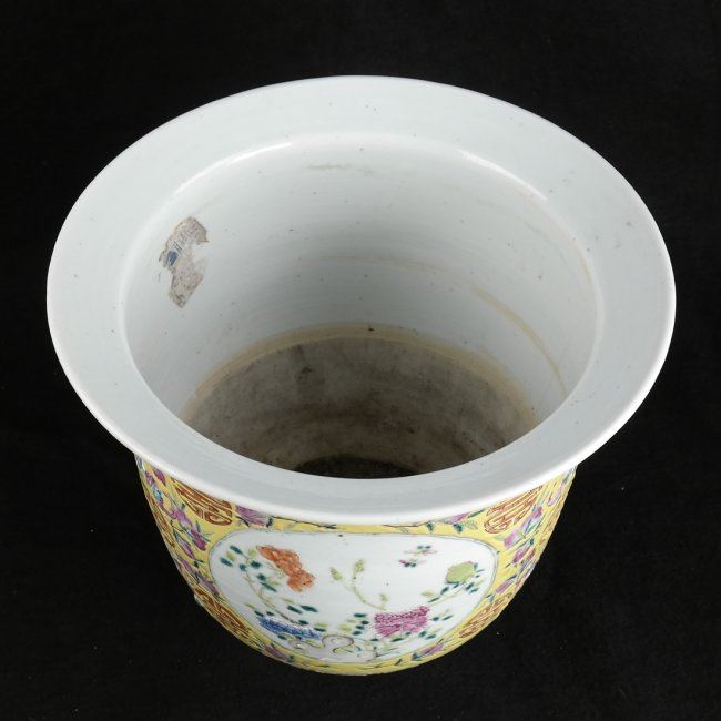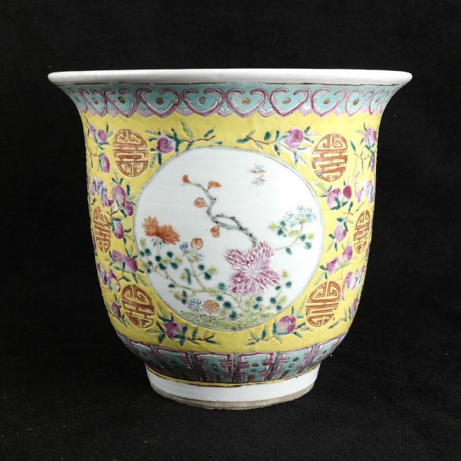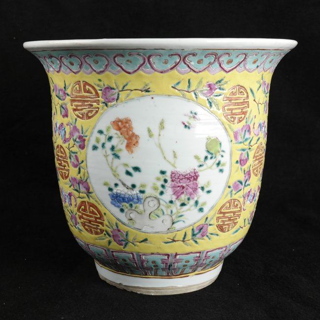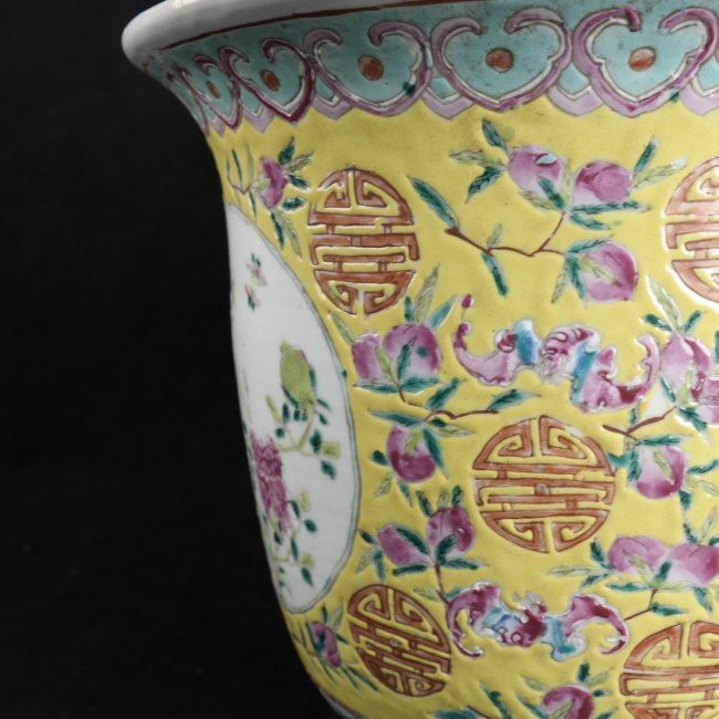 Painted Asian-style round jardiniere. [9 3/4" H x 10 3/4" Dia]. In fair to good condition.