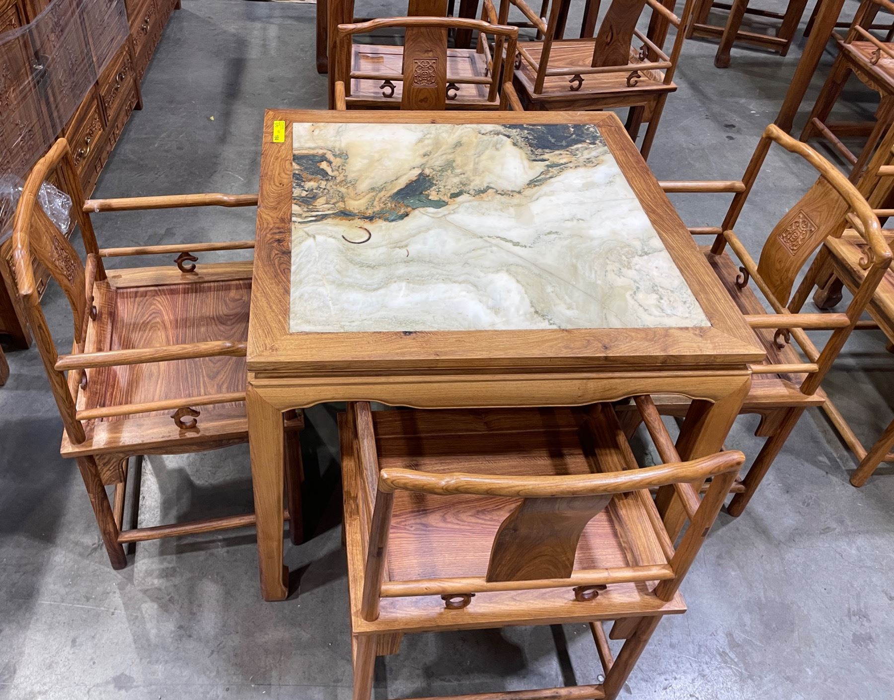Asian Style Walnut Table w/ Marble inlayed top (3ft square x 31 ) & 4 Walnut Chairs