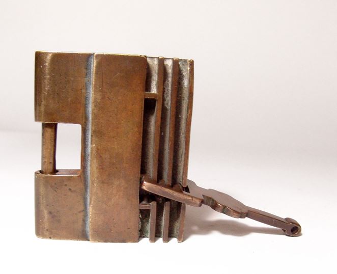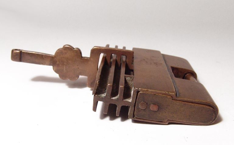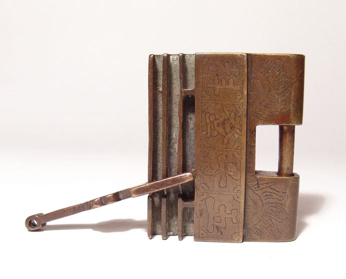 Asian bronze key lock with inscribed scene and figures, L: 2 4/5 in (7.2cm). Ex Rhode Island private collection.