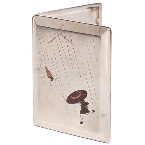 Asian cigarette case, silver with inlaid and enameled figures with umbrellas in a storm, design to interior, marked silver 950, signed, 3.25"l