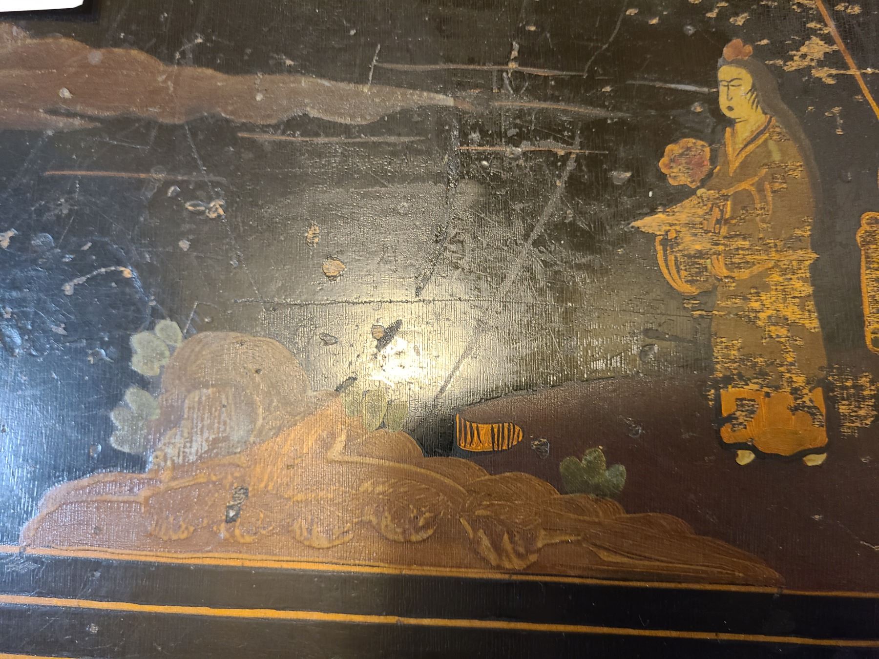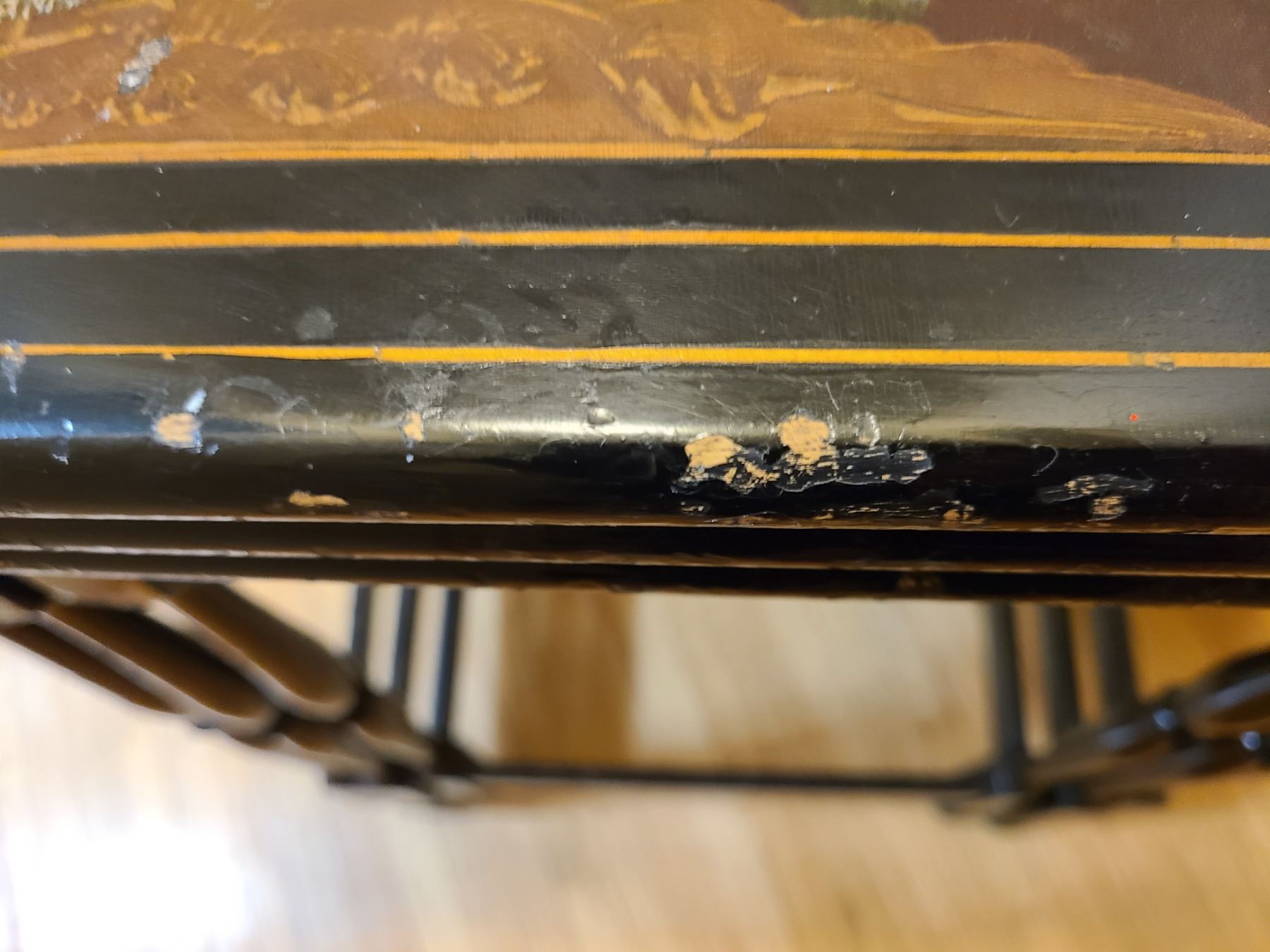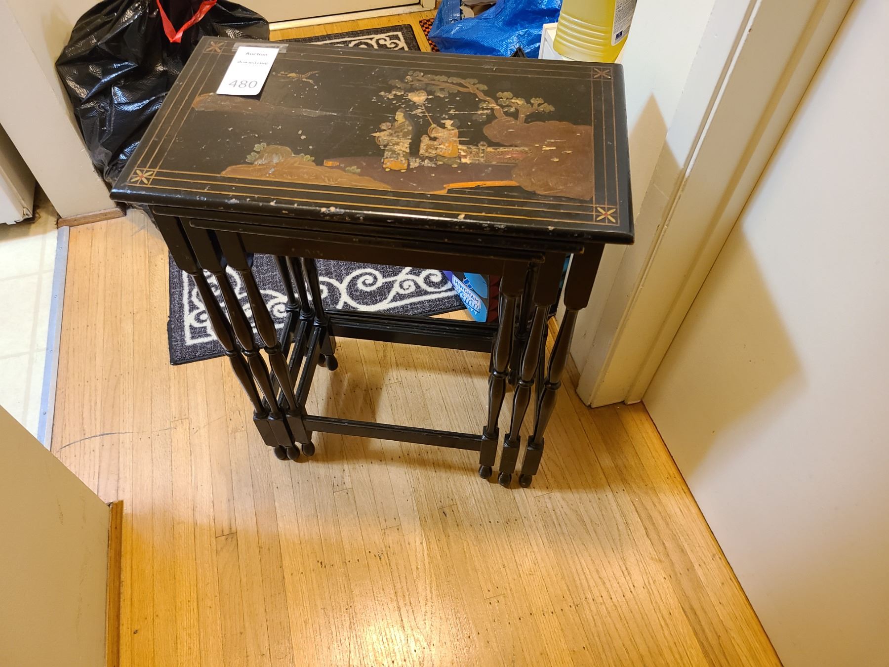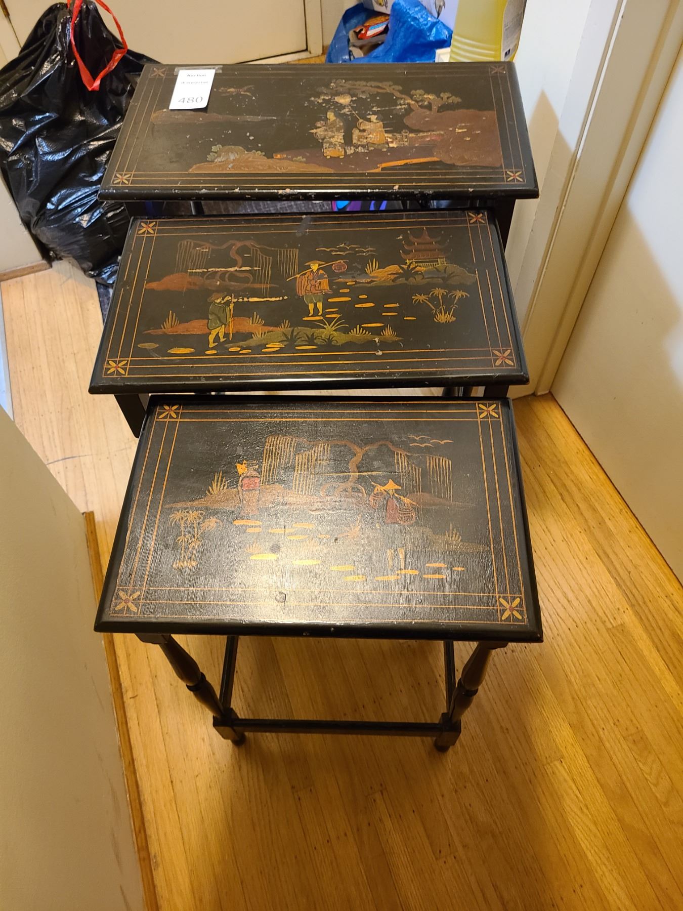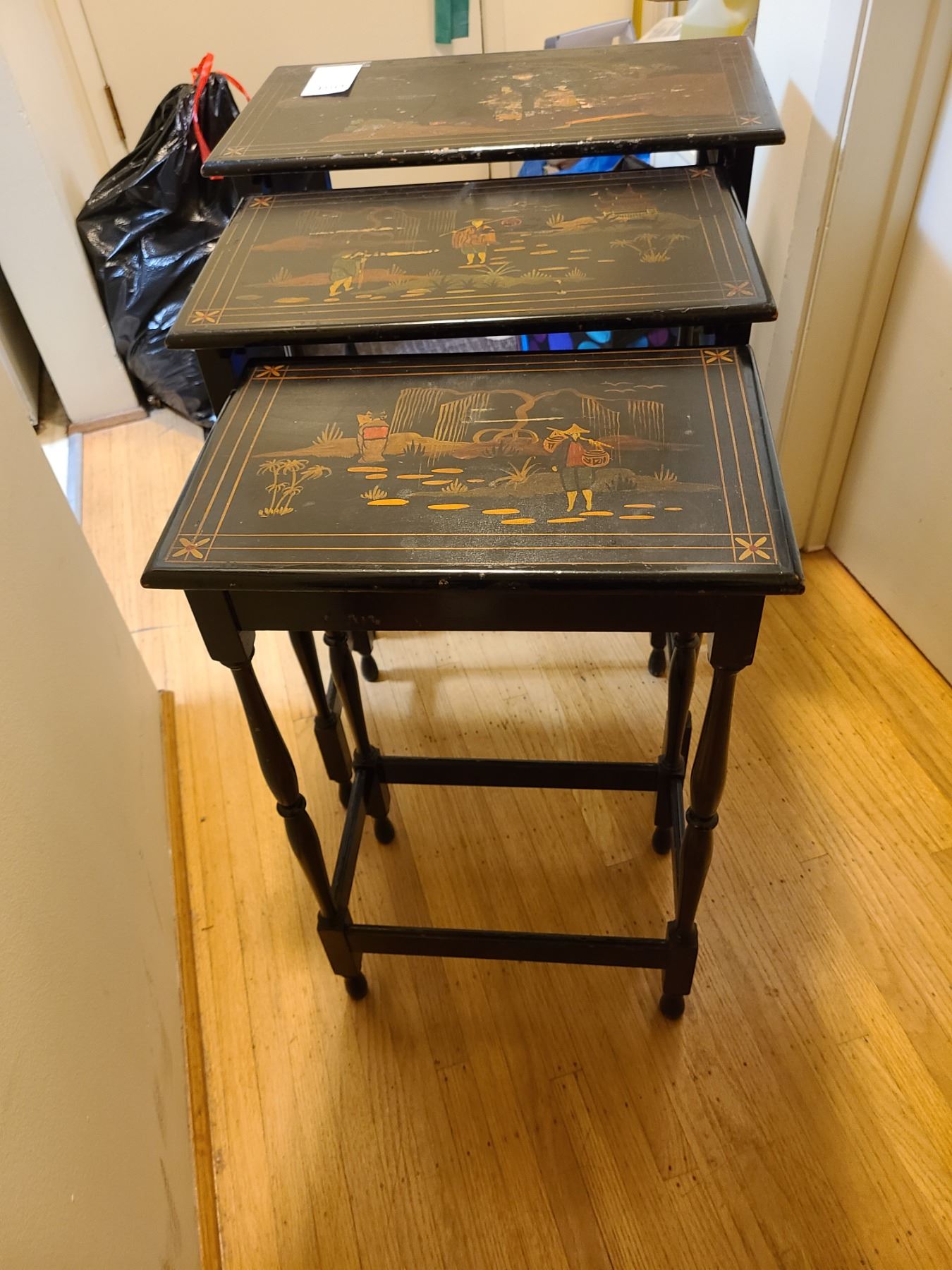 Nesting tables, Asian style, 3, 22x12x27. Note scratches on top. Pickup cat. A at 9 am.
