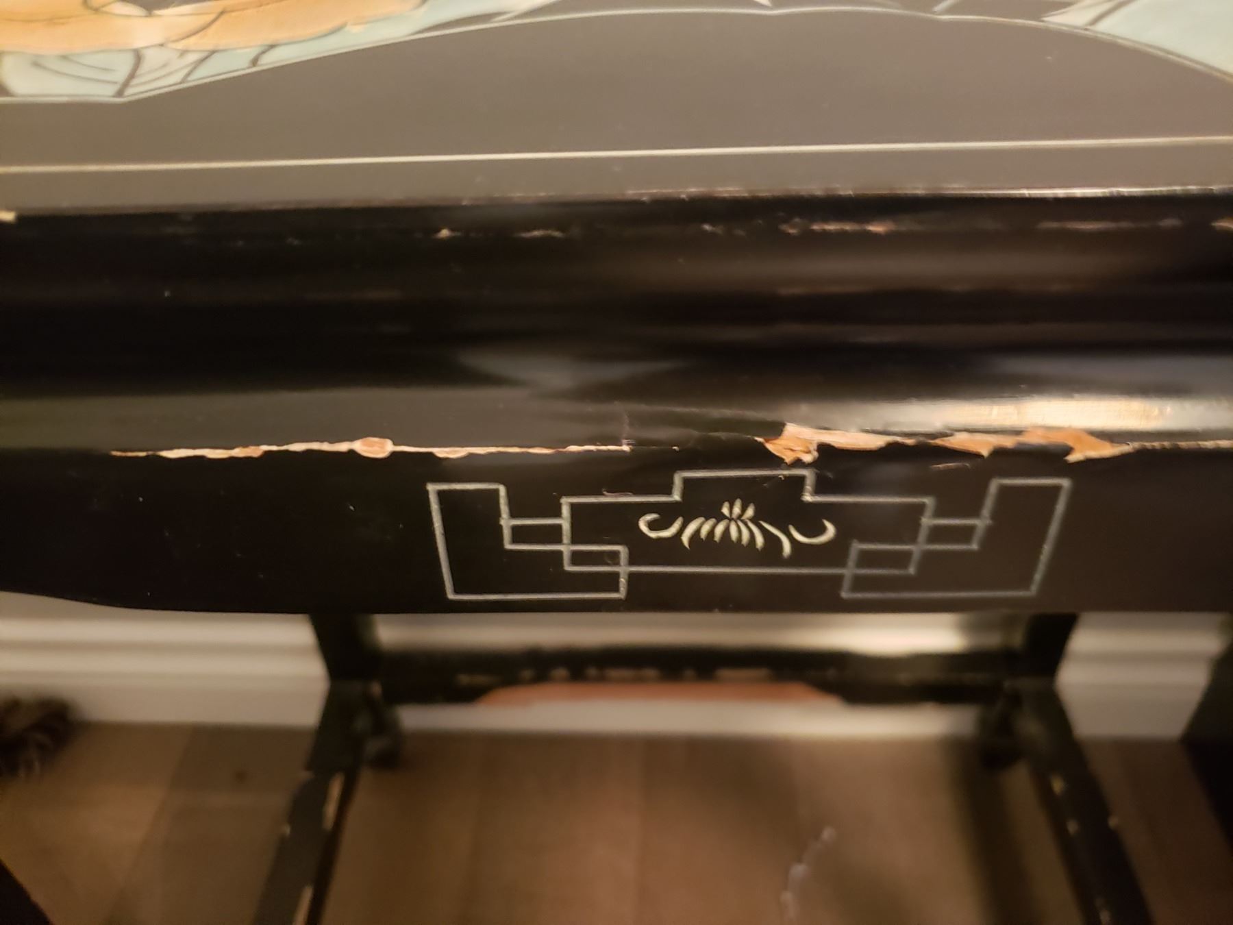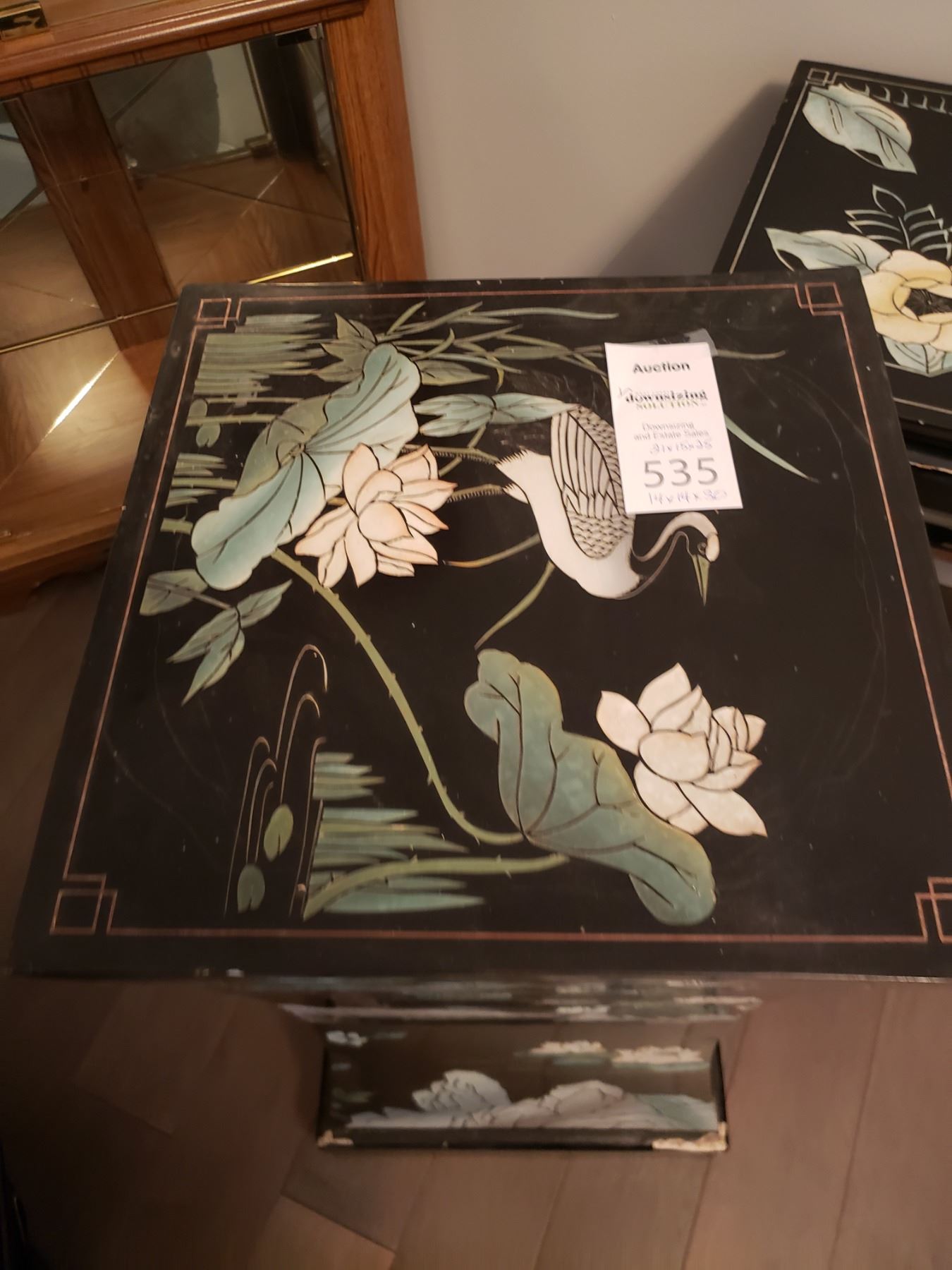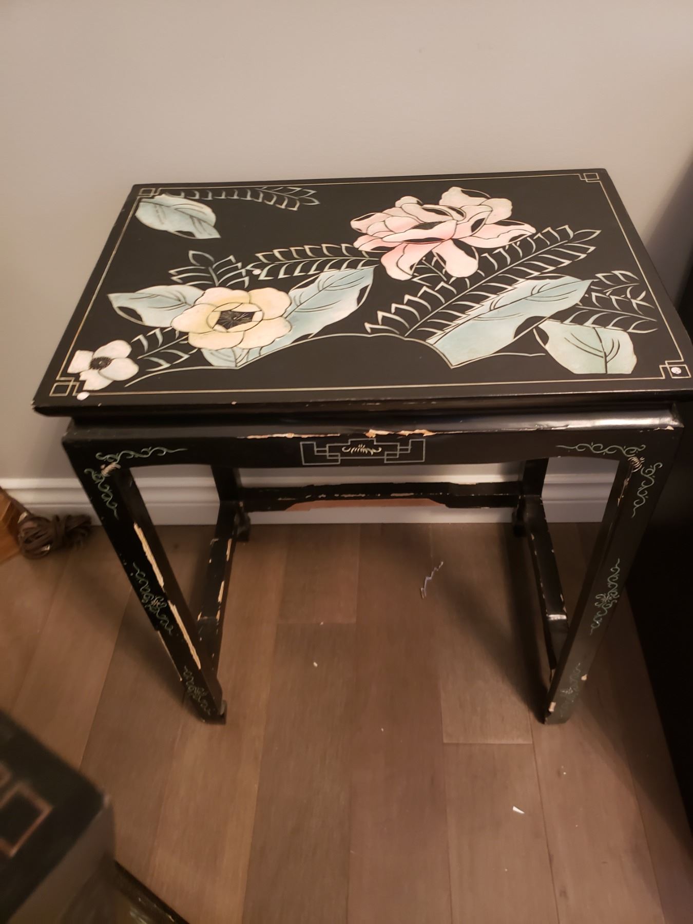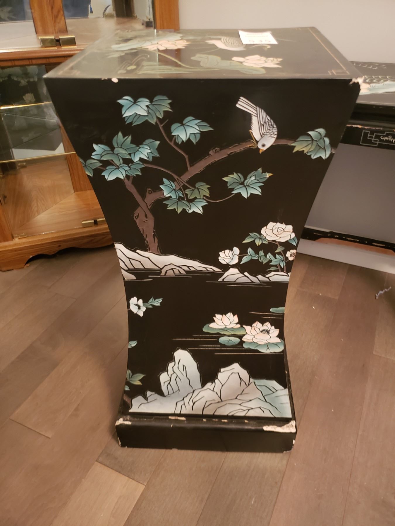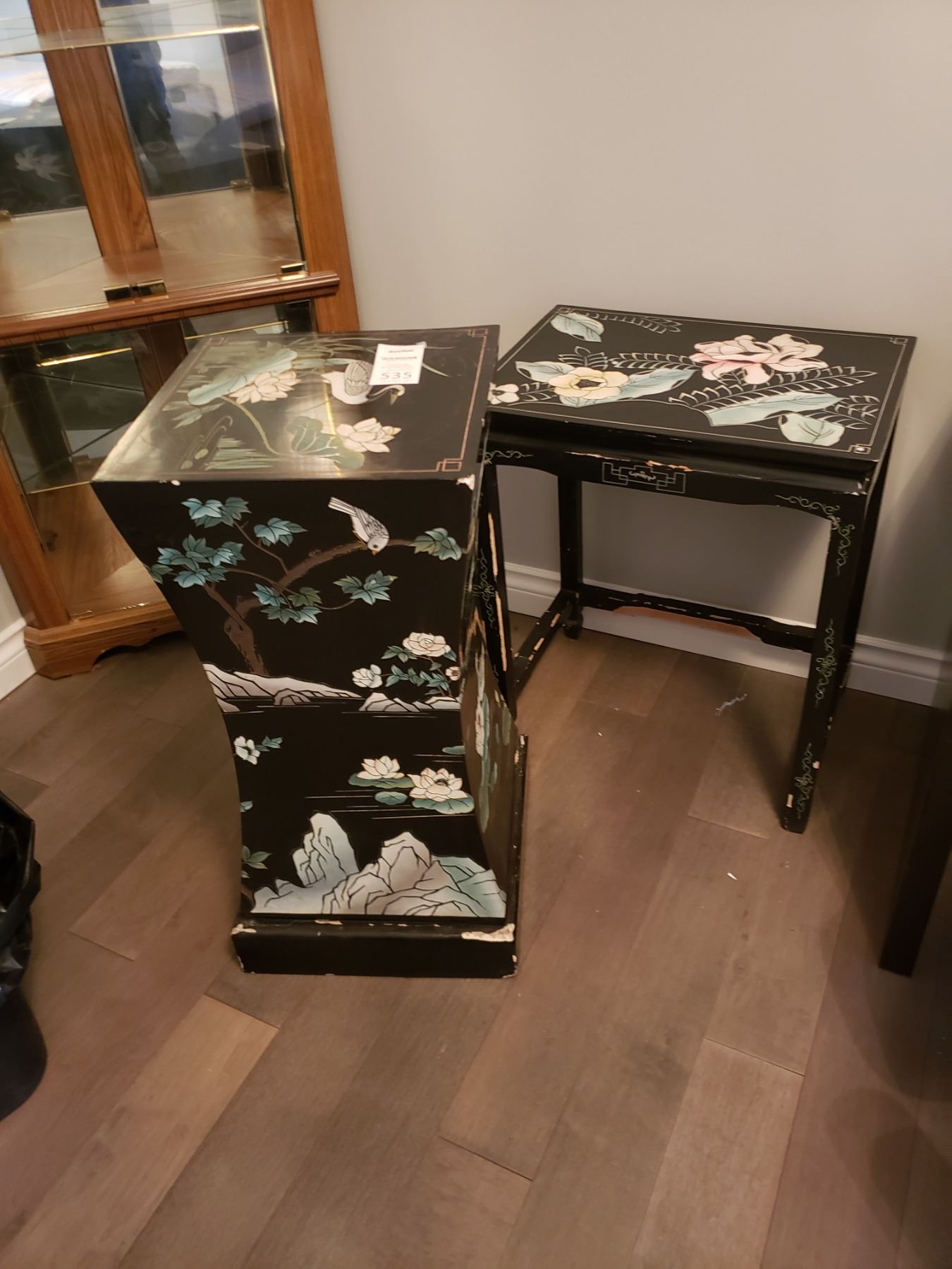 Asian style table, 21x15x25, and stand 14x14x30 in lot. Please note scratches and damage. Pickupin category B between 10am and 11 am.