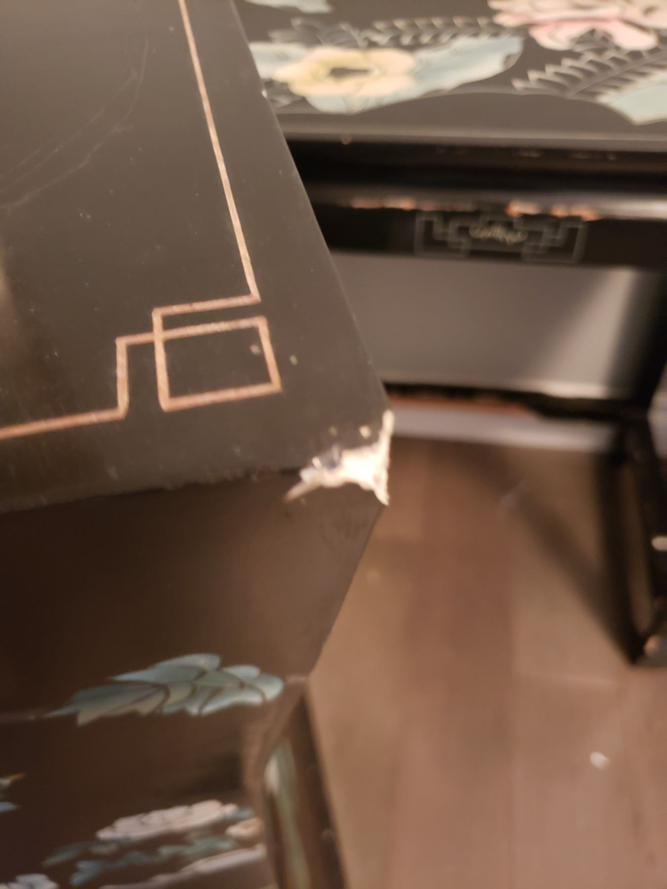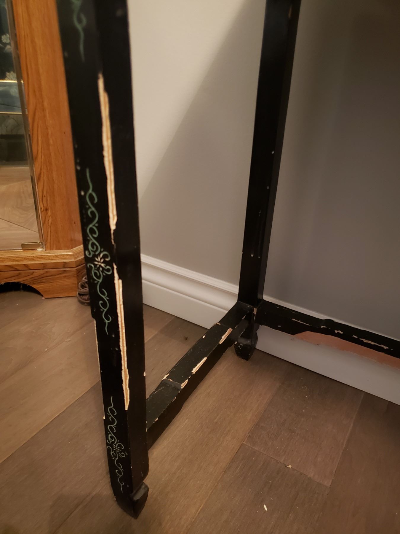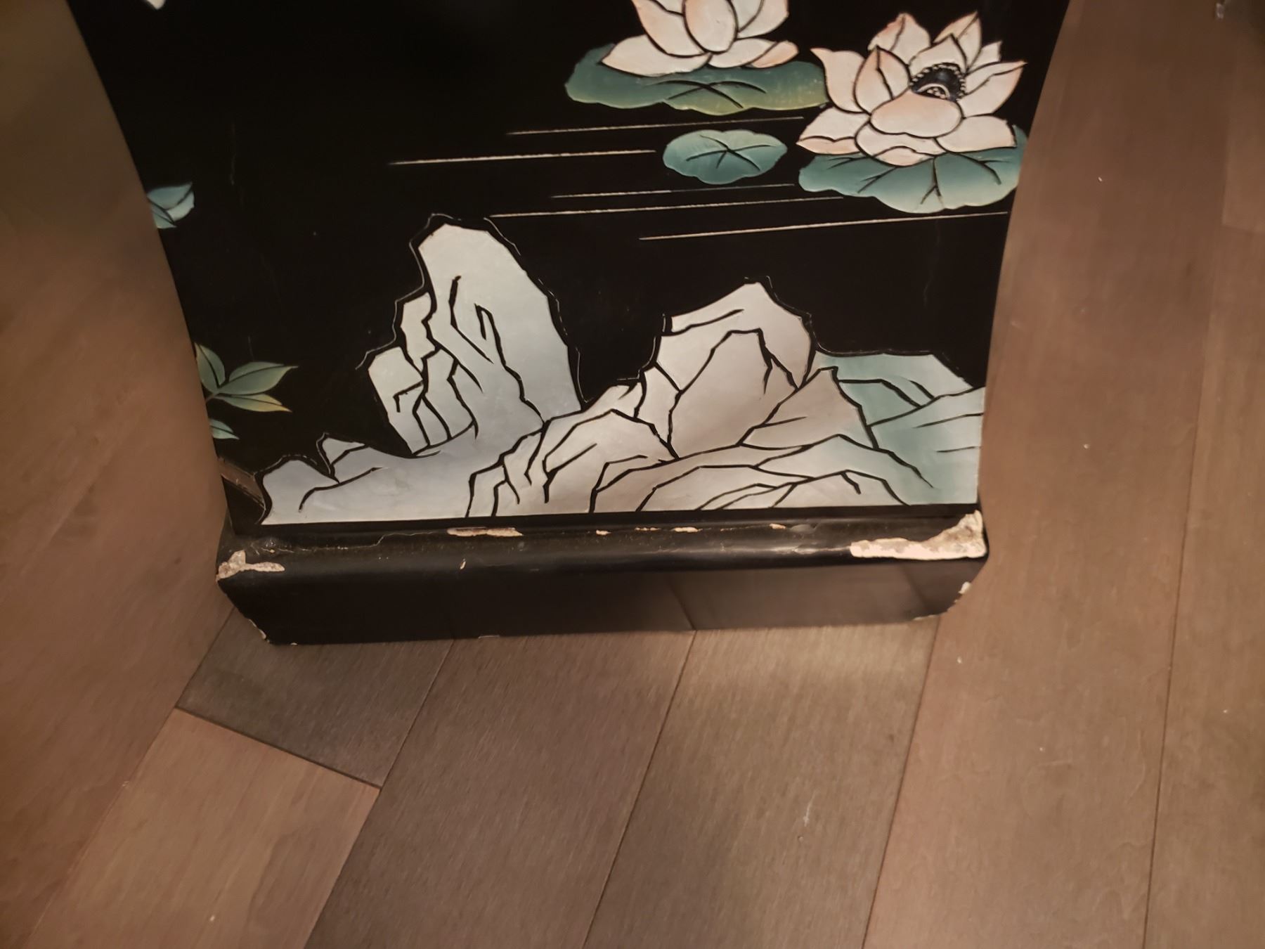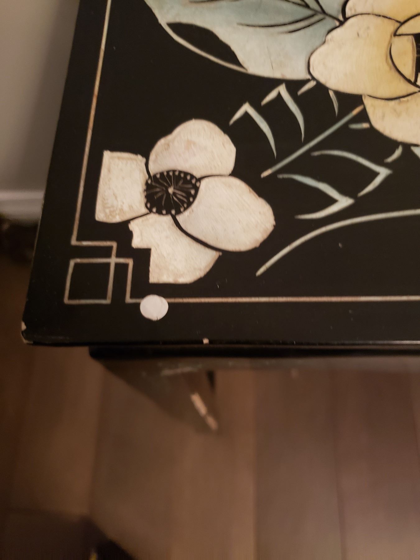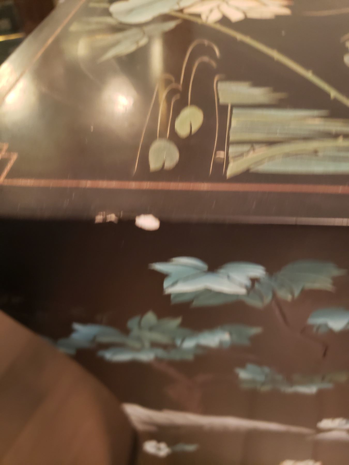 Asian style table, 21x15x25, and stand 14x14x30 in lot. Please note scratches and damage. Pickupin category B between 10am and 11 am.