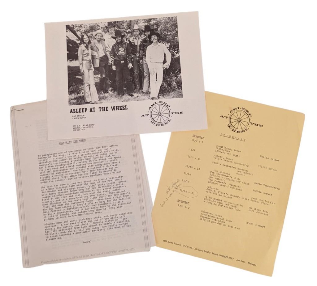 From Ray Benson's Collection, Three items include a vintage Asleep At The Wheel Promotional Poster 11 X 8.5 inches, Asleep At The Wheel Biography From Epic and Asleep At The Wheel Itinerary for the Month of November and the first two days of December. From Ray Benson's personal collection.