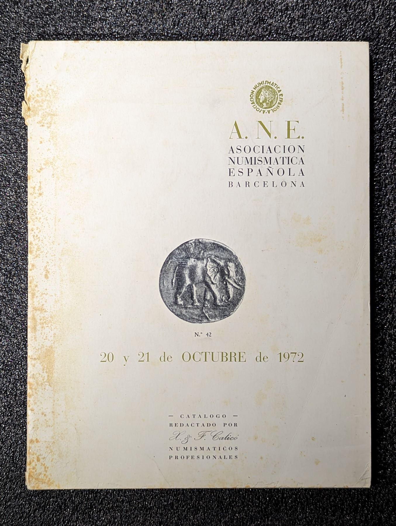 Asociacion Numismatica Espanola, X.&F. Calico. SUBASTA. October 20-21, 1972. 4to. 1-1104 Lots. Original pictorial card covers. Public Auction Sale. Barcelona. 59 Pages. 41 b&w coin, currency and medal plates. Spine and edge wear. Foxing. Price estimates sheet laid in. Very Good. Lot weight: 0 lbs 9oz. Subject(s): Ancient, Spanish, Spanish American, World Coinage, Medals, Paper Money.
