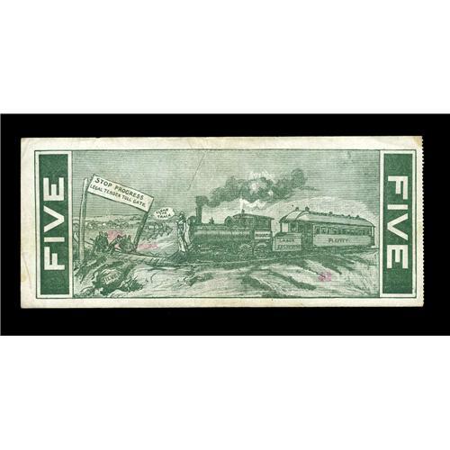 <B>Aspen, CO- Labor Exchange</B></I> $5 1896<BR>A truly great piece, as full size whole unit scrip is seldom found from any Labor Exchange branch, let alone one as rare as the Aspen branch. Sharp <B>Extremely Fine.</B></I>