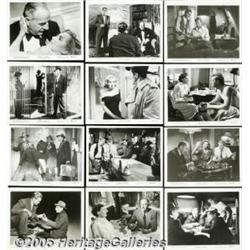 <B>Asphalt Jungle (MGM, R-1954)</B></I> Lobby Card Set of 8 (11" X 14") - Stills (12) (8" X 10"). Legendary director John Huston gave the <I>film noir</B></I> genre one of its classic films with "The Asphalt Jungle". Sterling Hayden and a group of criminals plan the ultimate heist before things inevitably go wrong. Marilyn Monroe makes a brief but memorable cameo in the part that launched her to fame. Offered in this lot is the 1954 reissue lobby card set and twelve stills. Marilyn had come along way from when this film was initially released and MGM made her the focal point in this lobby set. Not only is she featured prominently on the title card but also on three of the scene cards. There is wrinkles, small tears, stains, and creases on the borders and a few marks in the graphics. The set of still has minor border imperfections. Fine/Very Fine. 20 items