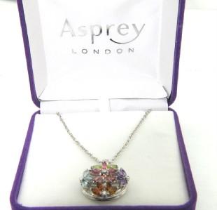 Brand New Asprey 18K White Gold, Multi-Colored Stone & Diamond Necklace ( Blue Topaz, Amethyst, Tourmaline & Citrine) With Original Box. Weight of Necklace: 14.3 grams. The total weight of diamond: 0.26 cts. H color VS clarity. The size of multi-colored stone: 3 x1 mm. The length of Necklace: 17.75". The measurement of pendant: 29 x 22 mm