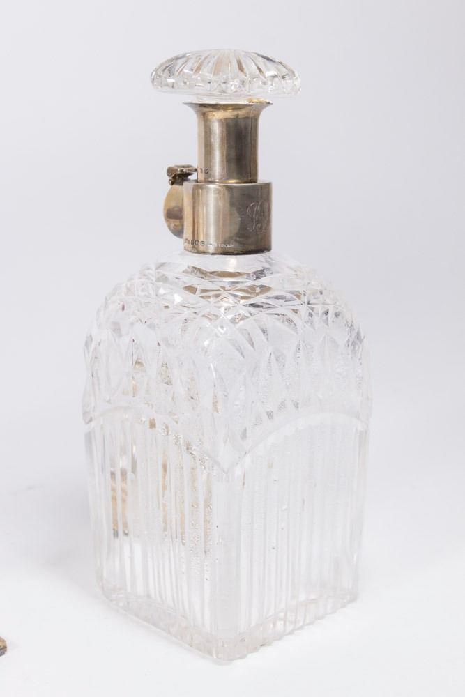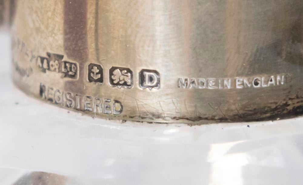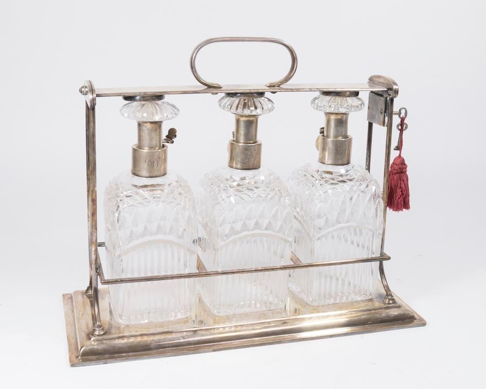 Hallmarked. With 2 keys, 1 for safe and 1 for bottles. Holder is silverplated, bottle necks sterling silver. Approx. 12 1/4" H x 15 1/4" W x 6 1/2" D.