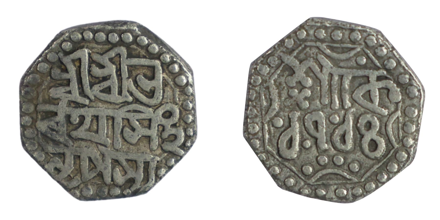Bharatha Simha, Octagonal Silver ¼ Rupee, SK. 1714, 2.74g, 13.69mm, Assamese legends in three lines on obverse, Obv: "Sri Sri Bha/rath Simha/ Nripeshy", Rev: "Sake 1714", (RB# W14.2, KM# 403), Very fine, Extremely Rare.