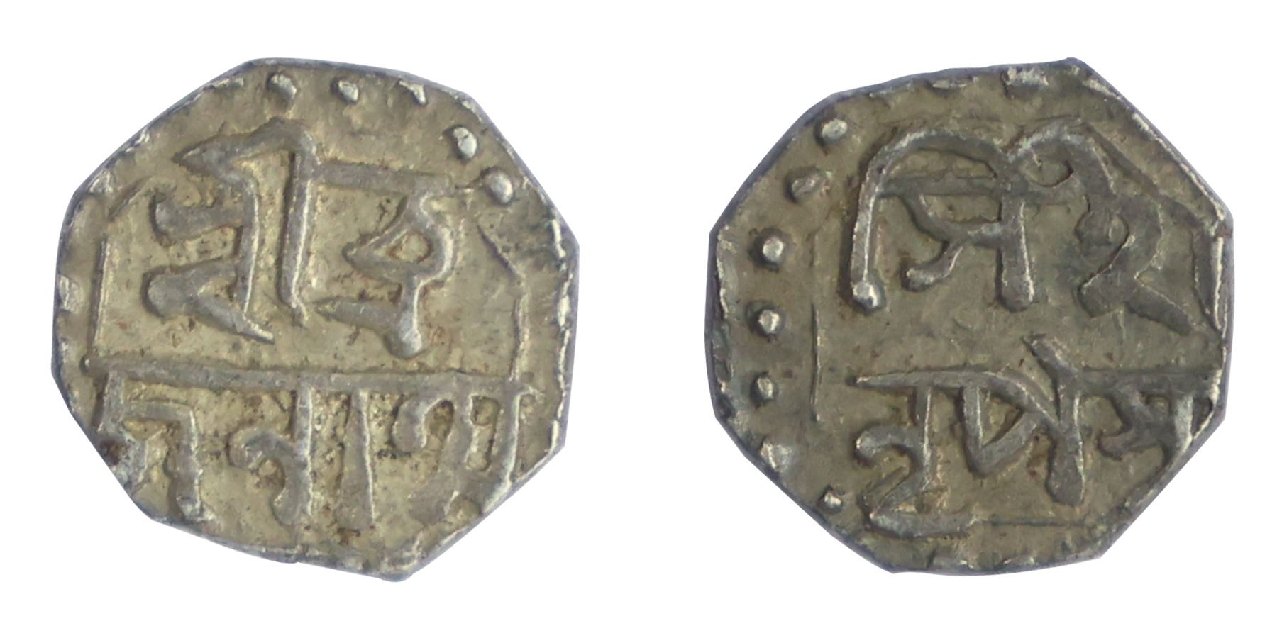 Assam, Brajanath Simha, Octagonal Silver 1/16 Rupee, 0.71g, 8.78mm, Assamese legends in two lines on each side. Obv: "Sri Bra/janatha", Rev: "Simha/ Nripasya". (RB# T16.1, KM# 261), Extremely Fine, Scarce.