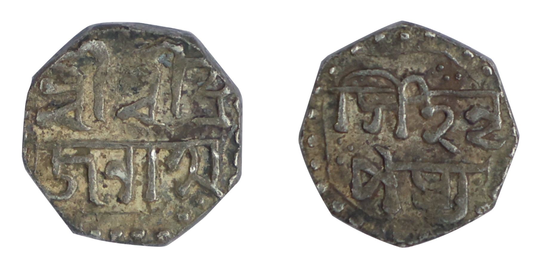 Assam, Brajanath Simha, Octagonal Silver 1/8 Rupee,1.37g, 10.32mm, Assamese legends in two lines on each side. Obv: "Sri Sri Bra/janatha", Rev: "Simha Nri/pasya". (RB# T14.1, KM# 262), Very Fine, Scarce.