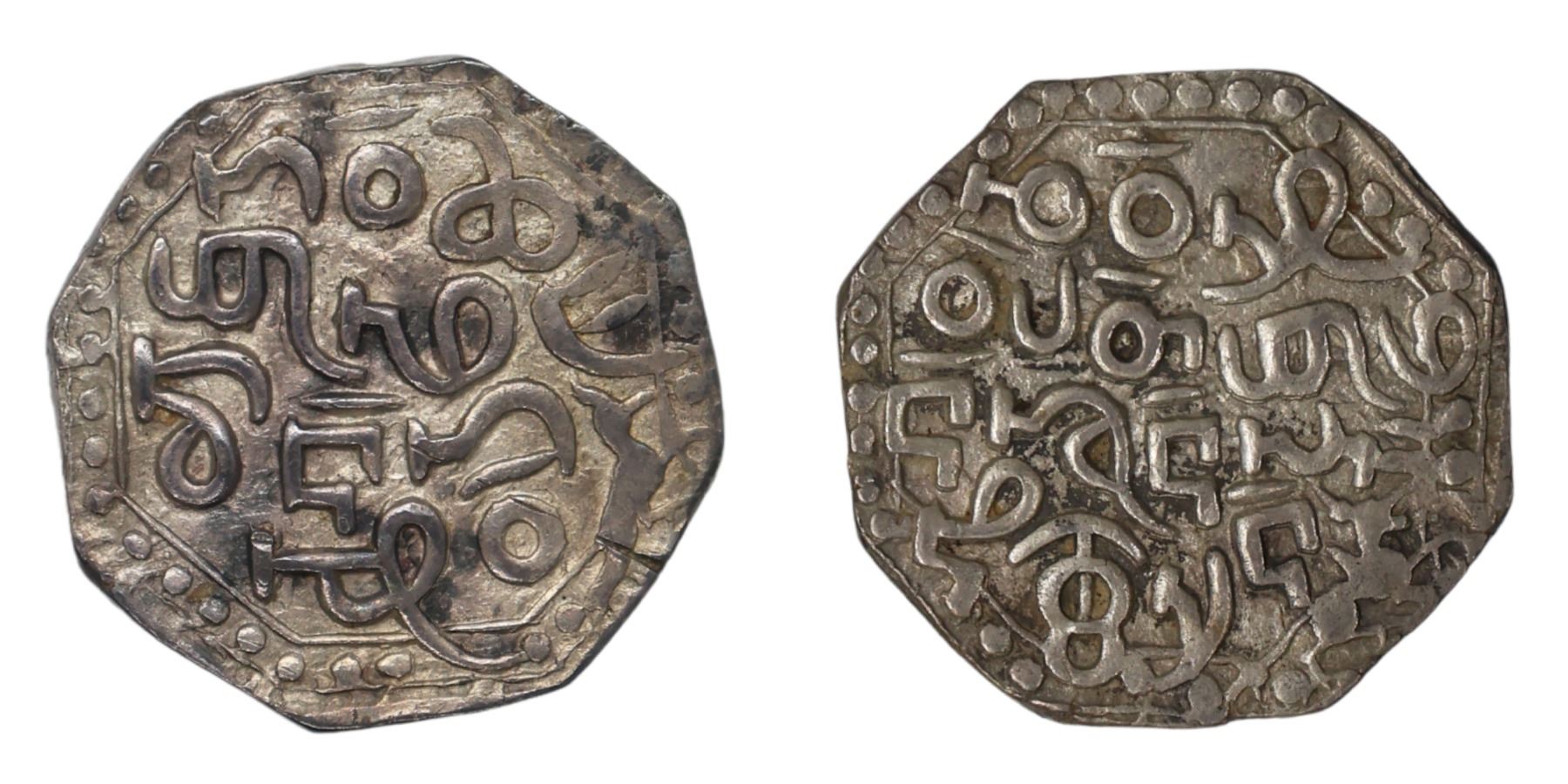Assam, Gadadhara Simha / Siu-pat-pha (SE 1603–1618 / 1681–1696 AD), Octagonal Silver Rupee, 11.08g, 24.71mm. Ahom legends 4 lines each side. Obv: “KÄoboi/phÄ Leng-don heu/chiu†with bird walking right. Dated 33rd year of cycle. Rev: “Chao Siu-pat-phÄ/pi n khunlÄk-ni/RÄi-sÄn†with lion right. (RB E6.1, KM 33), Very Fine, Rare.Notes: Gadadhara managed to survive the decade of disturbances following the death of Chakradhvaja Simha. Early in his reign he expelled the Muslims from Pragiyotishpura (now Guwahati), thereby capturing a large amount of booty, which presumably enabled him to strike much of his coinage. All his coins are dated to the 33rd year (of the 60-year cycle) used by the Ahom. The legends invoke the Ahom deity, Lengdon, often identified as Indra. One or more bird symbols also often occur on the coins, as does a lion.