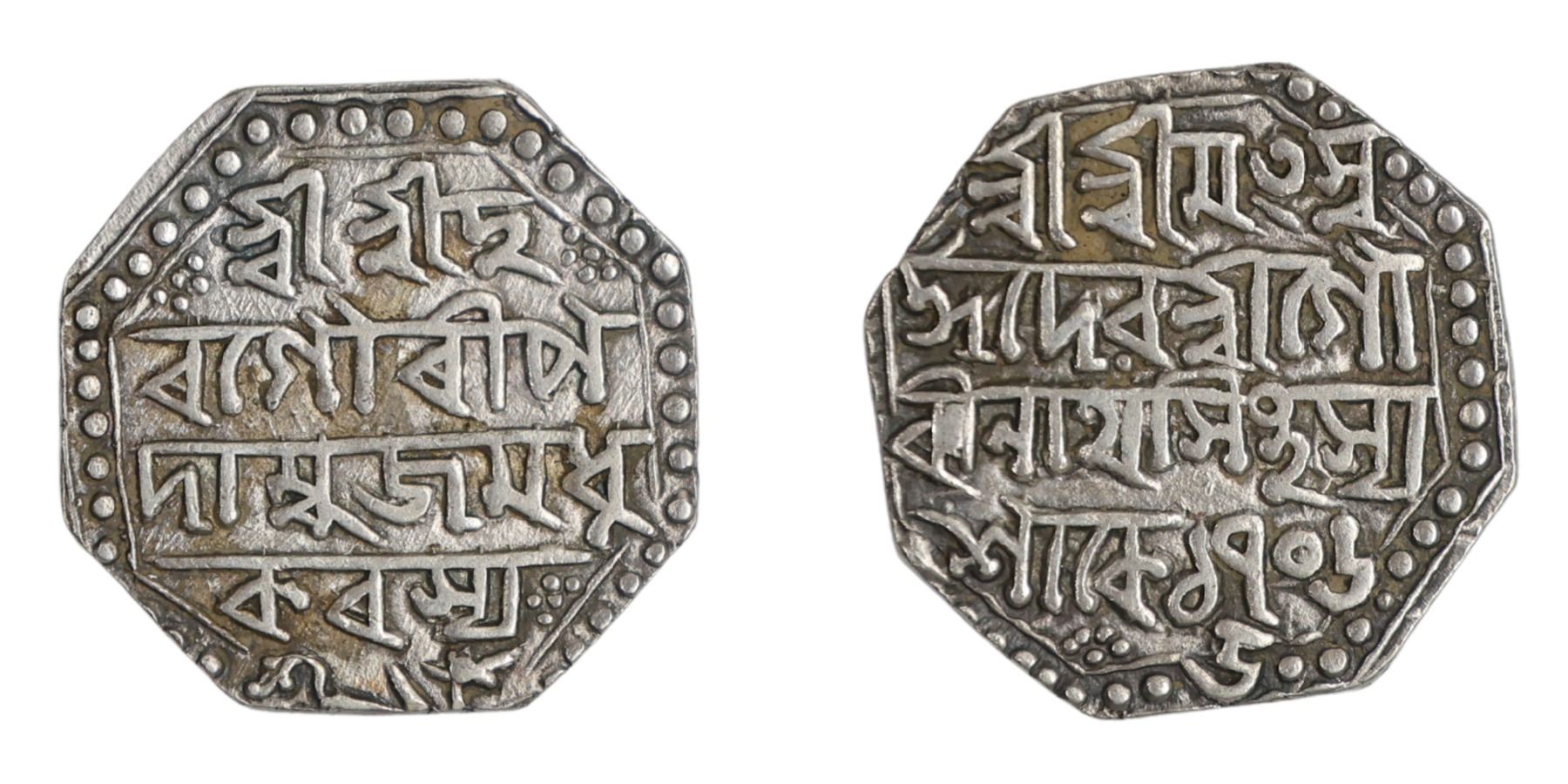 Assam, Gaurinath Simha, Octagonal Silver Rupee, SK. 1706/5, 11.30g, 24.33mm, Assamese legends in four lines on each side, Obv: "Sri Sri Ha/ra Gauri Pa/dambuja Madhu/ Karasya". Lion running right. Rev: "Sri Srimat Swa/rga Deva Sri Gau/rinatha Simhasya/ Sake 1706/5", (RB# R38.3, KM# 217), Extremely Fine, Scarce.It's a unique coin of Gaurinath series where the king introduced himself as 'Sri Srimat Swarga Deva'. It translates to 'Heavenly King' or 'Divine Lord of Heaven'. In Hindu cosmology, Swarga is the heavenly realm where the deities, including Indra, reside.