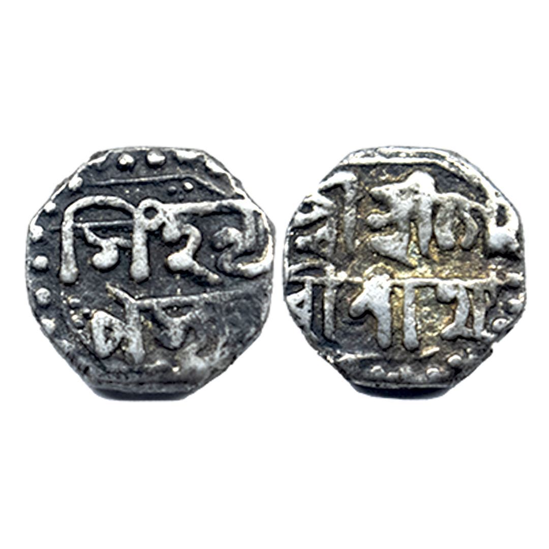 Assam, Gaurinath Simha (1780-1795 AD), silver ⅛ rupee, without Date, 1.38g. Obverse: “Sri Sri Gau/rinath”. Reverse: Simha Nri/pasya, both sides legend in two lines. R&B# R124.1, Good Very fine.