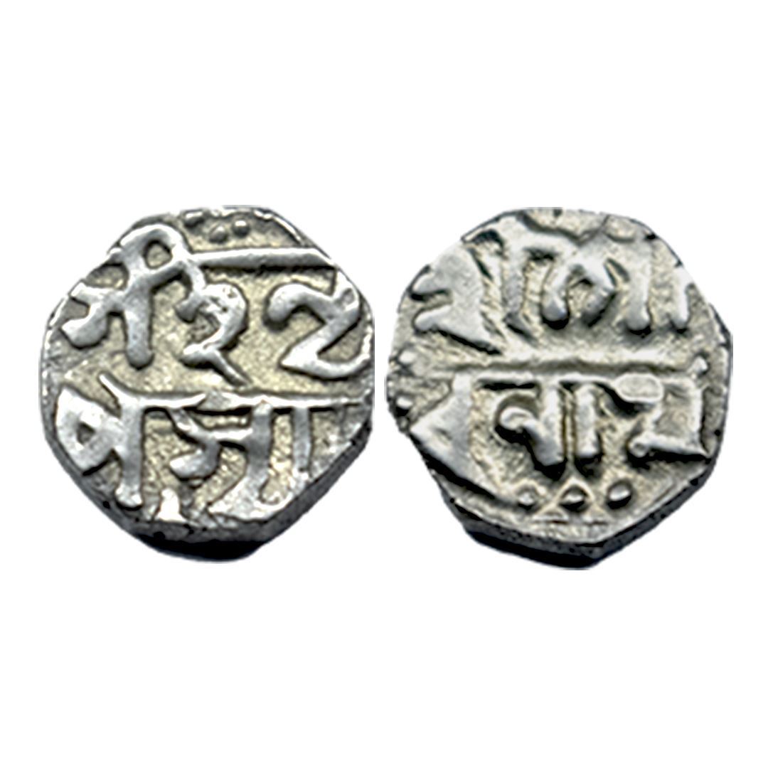 Assam, Gaurinatha Simha (SE 1702-1718 / 1780-1796 AD), Silver 1/16 Rupee, 0.72Grms, OBV: Sri Sri Gau/rinatha, REV: Simha/ Nrpasya. (A.Mitra # 432 types). Fine+.