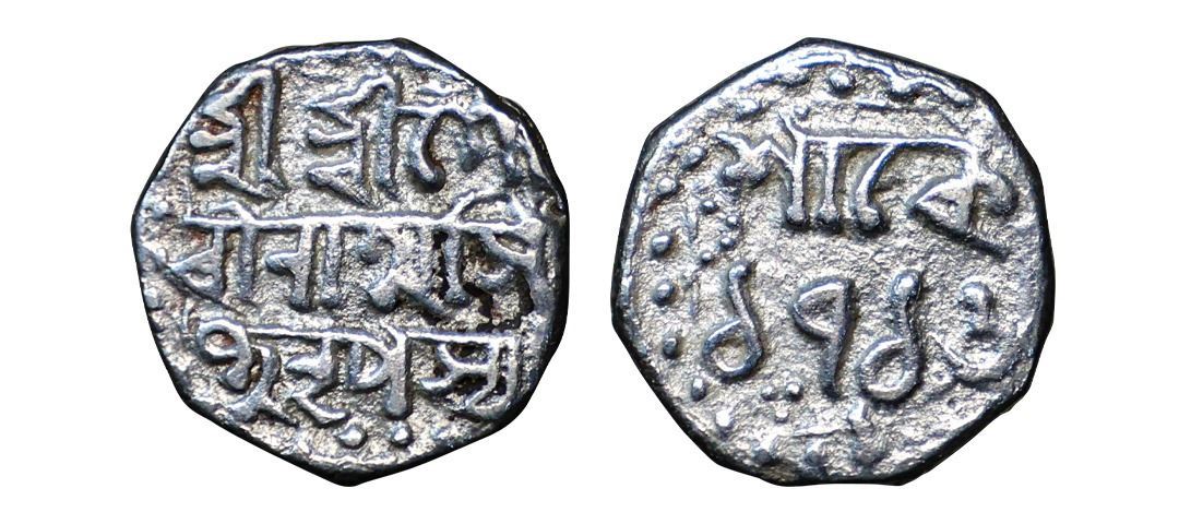 Assam, Gaurinatha Simha (Se 1702-1718 / 1780-1795), Silver 1/4 Rupee, 1.99g, SE 1716, , Obv: Sri Sri Gau / ri natha si / mha Nripasya, Rev: Sake 1716. (KM # 200). Fine.