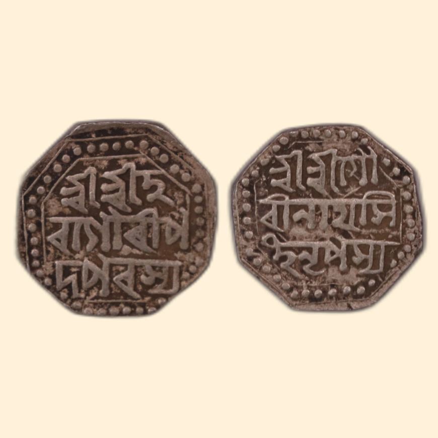 Independent Kingdom, Assam, Gaurinatha Simha / Suhitpanpha (SE 1702-1718 / 1780-1796 AD), Silver ½ Rupee, 5.70gms, Assamese legends on both sides, Obv: Sri Sri Ha ra Gauri Pa/da Parasya, Rev: Sri Sri Gau rinatha Si mha Nrpasya. (R&B # R67).