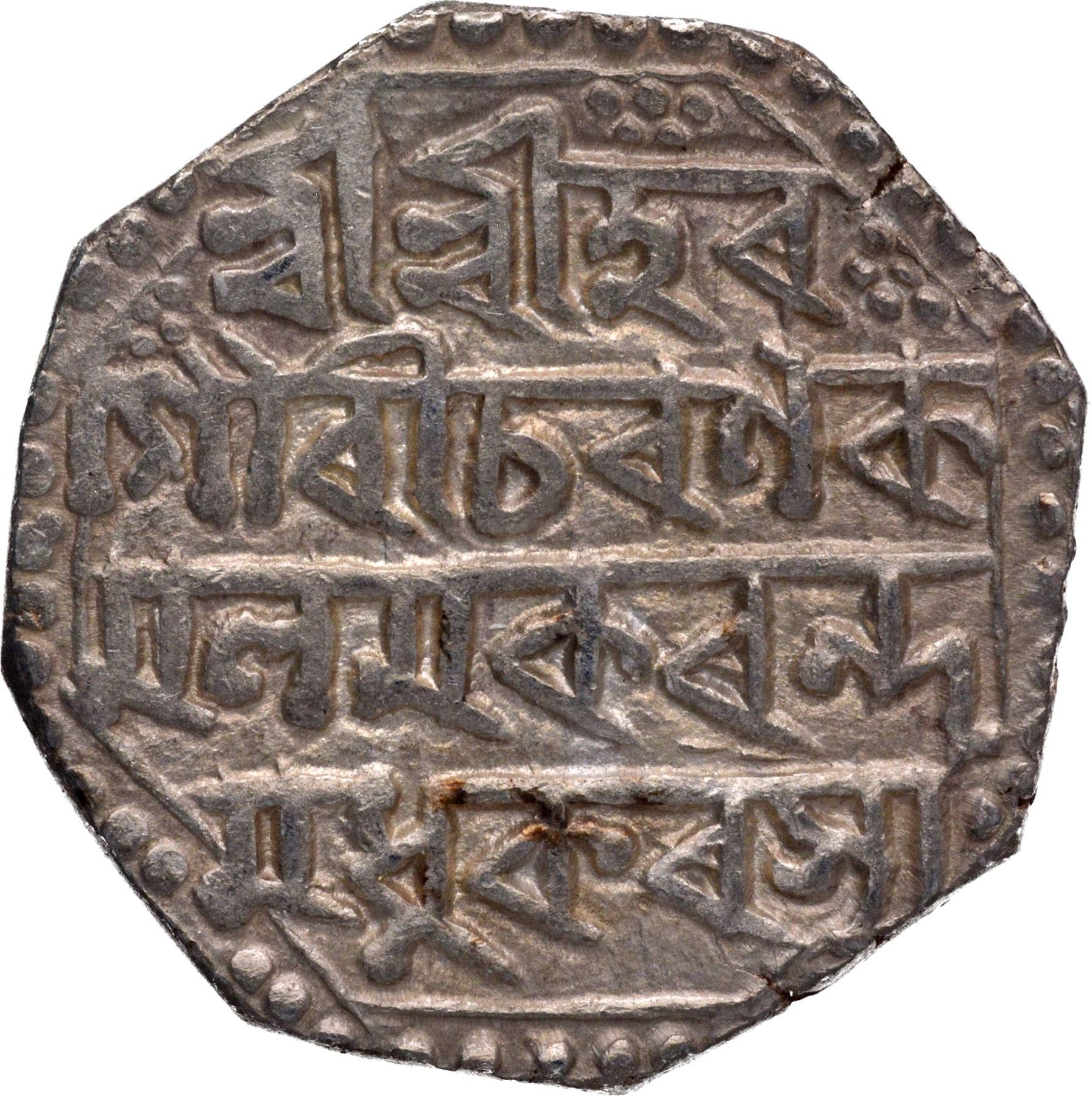 Assam Kingdom, Gaurinatha Simha (Suhitpanpha) (SE 1702-1718/1780-1796 AD), Silver Rupee, SE 1708/ 7 RY, Obv: Assamese legend "sri sri hara / gauri charana ka / mala makaranda / madhukarasya", Rev: Assamese legend "sri srimat sva/ rga deva sri gau / rinathasya / saka 1708 and 7", 11.5g, 22.25mm, (KM # 218/RB # R40.2), XF, Scarce.
