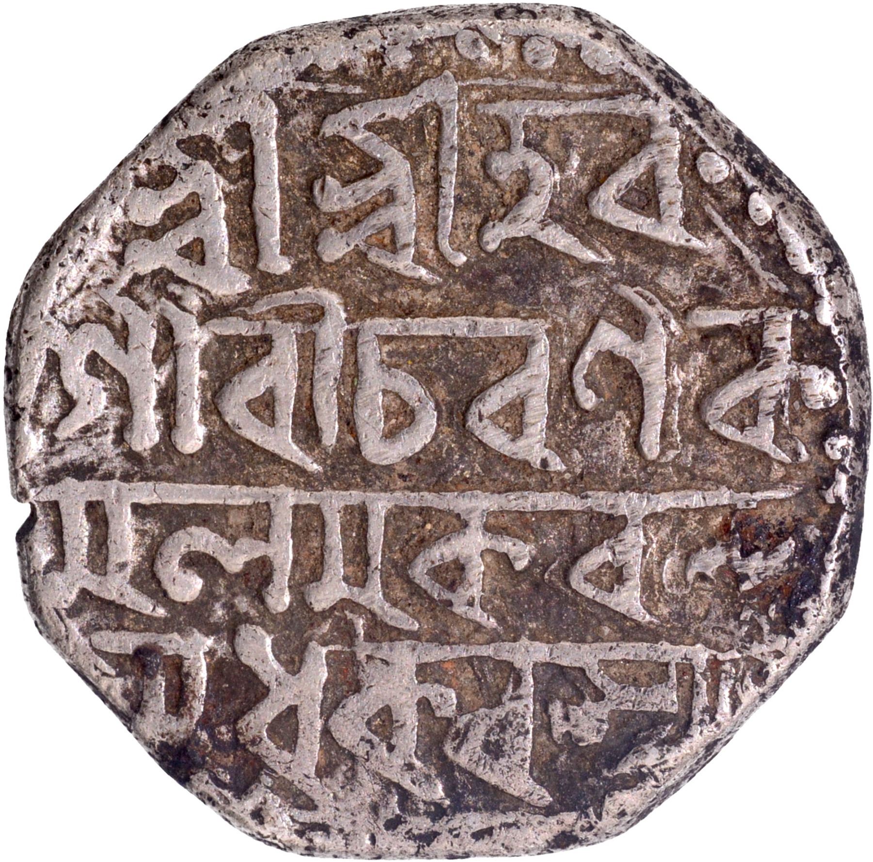 Assam Kingdom, Gaurinatha Simhaor Siu-hit-pang-pha (SE 1702-1718 /1780-1794AD), Silver Rupee, Saka Era 1716, Obv: Assamese legend Sri Sri hara /Gauri charana ka /mala makaranda /madhukarasya, Rev: Assamese legend Sri Srimatsva /rga deva Sri Gau /rinathasya /saka 1716,below lion facing to left,11.08g, 23.12mm, (KM # 218 /RB # R 52.1), about very fine, Scarce.