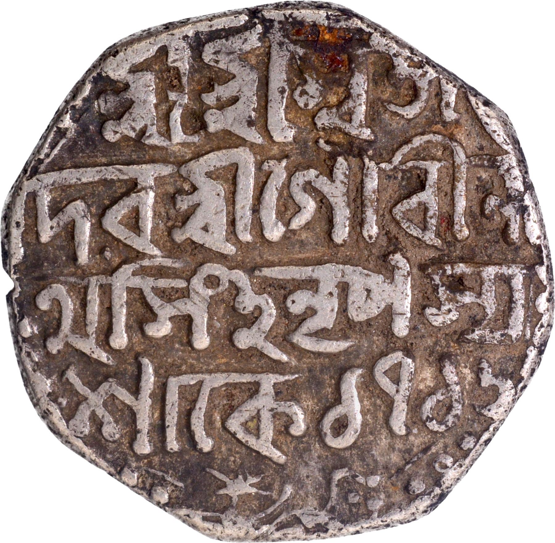 Assam Kingdom, Gaurinatha Simhaor Siu-hit-pang-pha (SE 1702-1718 /1780-1794AD), Silver Rupee, Saka Era 1716, Obv: Assamese legend Sri Sri hara /Gauri charana ka /mala makaranda /madhukarasya, Rev: Assamese legend Sri Srimatsva /rga deva Sri Gau /rinathasya /saka 1716,below lion facing to left,11.08g, 23.12mm, (KM # 218 /RB # R 52.1), about very fine, Scarce.