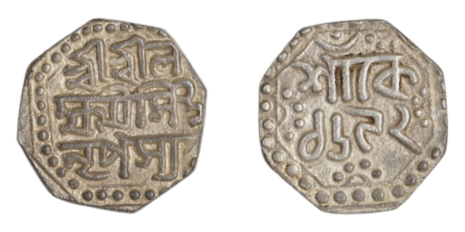 Assam, Lakshmi Simha, Octagonal Silver ¼ Rupee, SK. 1692, 2.86g, 13.64mm, Assamese legends in three lines on obverse. Obv: "Sri Sri La/kshmi Simha/ Nrpasya". Rev: "Sake/ 1692", Crescent with dot above and arc of pellets rest three sides. (RB# Q47.2, KM# 176), Extremely Fine, Scarce.