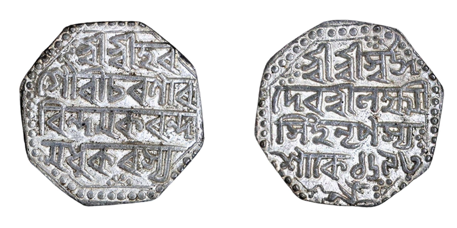 Assam, Lakshmi Simha or Siu-nyeo-pha (SE 1692-1702 / 1770-1780 AD) Octagonal Silver Rupee, SK. 1692, 11.33g, 23.80mm, Assamese legends in four lines on each sides. Obv: "Sri Sri Hara/ Gauri Charanara/vinda Makaranda/ Madhukarasya", Rev: "Sri Sri Svarga/ Deva Sri Lakshmi/ Simha Nrpasya/ Sake 1692". Lion running to right. (RB# Q26.3, KM# 182), Extremely Fine, Scarce.