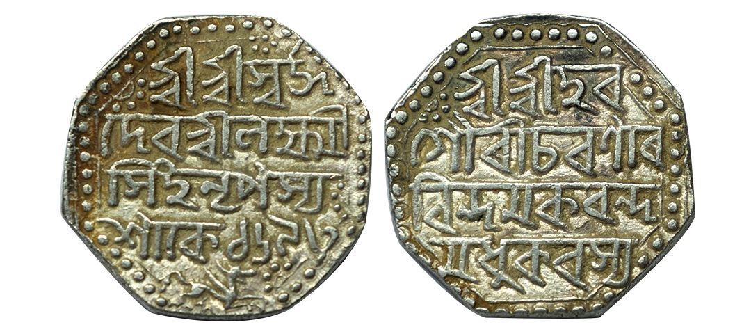 Assam, Lakshmi Simha or Siu-nyeo-pha (SE 1691-1702, 1769-1780), Silver Rupee, 11.37 gms, SE 1693, Obv: Assamese legend ‘Sri Sri Hara/ Gauri Charana Ra/ vinda Makaranda’, Rev: Assamese legend ‘Sri Sri Svarga/ Deva Sri Lakshmi Simha Nrpasya/ Sake 1693’, lion running right below, KM # 182/RB # Q26.1, extremely fine, rare.