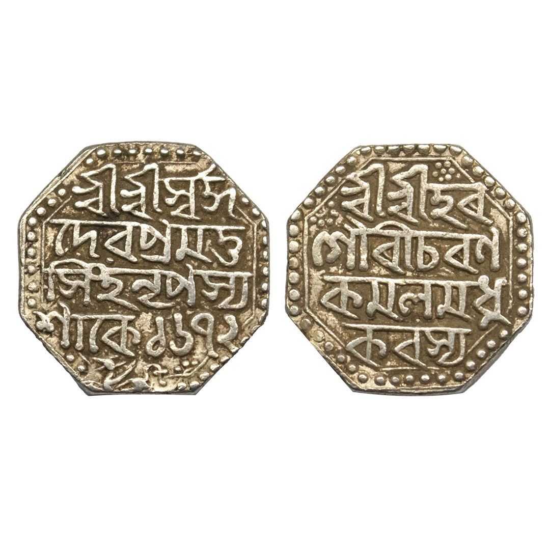 Assam, Pramatta Simha, Silver Rupee, 11.41g, SE 1672, Assamese legend on both sides within dotted border, Obverse: “Sri Sri Hara/ Gauri Charana/ Kamala Madhu/karasya”, Reverse: “Sri Sri Svarga/Deva Pramatta/ Simha Nrpasya/ Sake 1672”, Lion to left (R&B# N13.1). Very fine+.