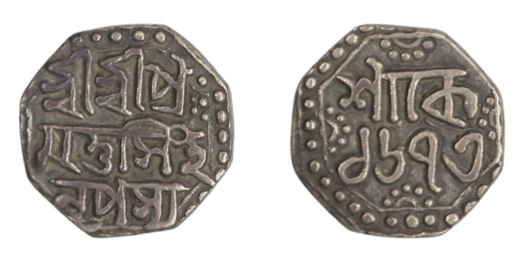 Assam, Pramatta Simha or Siu-ning-pha (SE 1666-1673 / 1744-1751 AD), Octagonal silver ¼ Rupee, SK. 1673, 2.78g, 14.26mm. Assamese legends in three lines on obverse. Obv: "Sri Sri Pra/matta Simha/ Nrpasya". Rev: "Sake/1673", Arc of pellets on top, bottom, left and right. (RB# N22.2, KM# 118), Extremely Fine, Scarce.