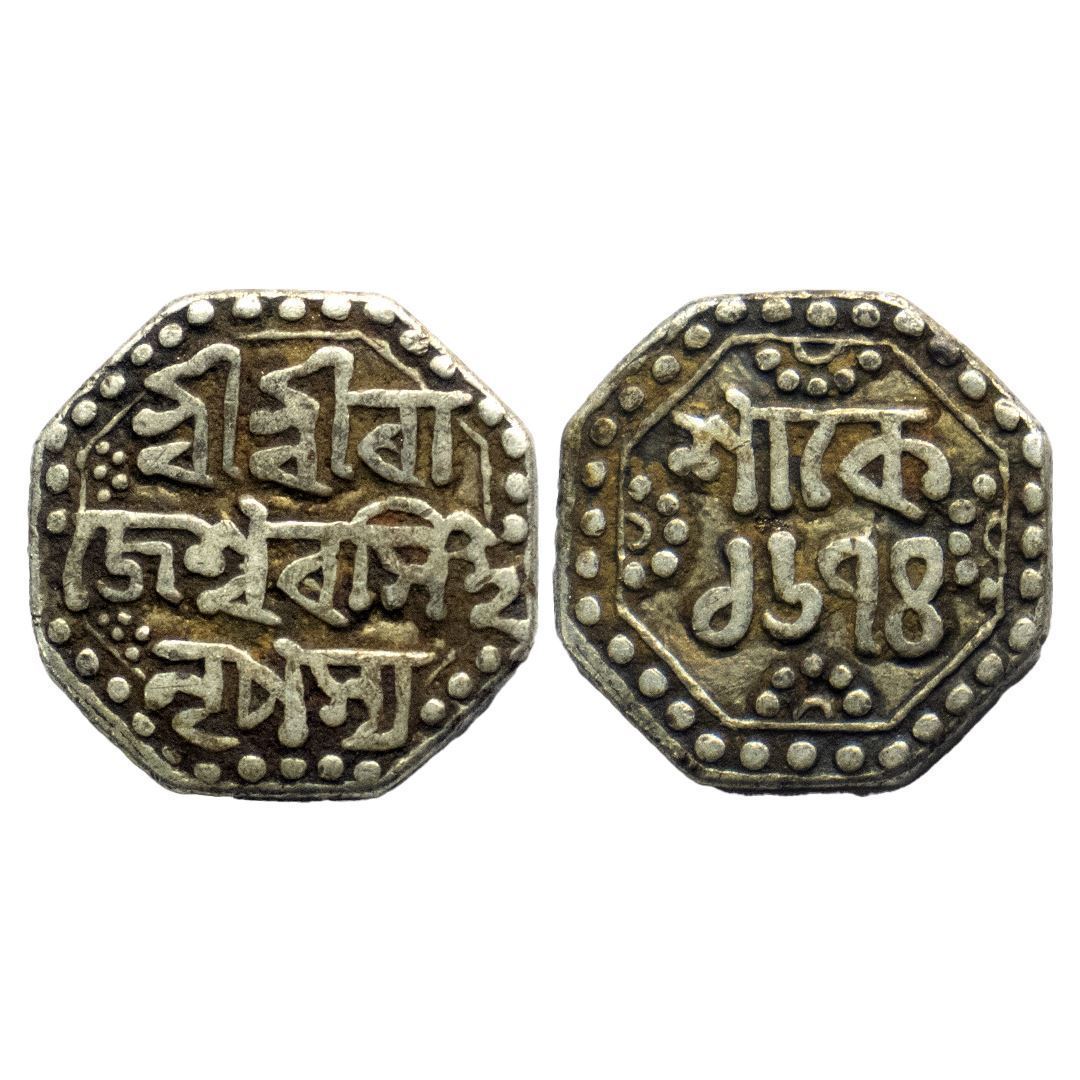 Assam, Rajesvara Simha (1751-1769 AD), silver & frac14; rupee, sake 1674, 2.81g. Obv: Legend Sri Sri Ra/jesvara Simha/NrPasya in three lines, dots upper left and lower right. Rev: Legend Sake/1676 in two lines, R& amp;B.O59.3.Very fine+, Very scarce.
