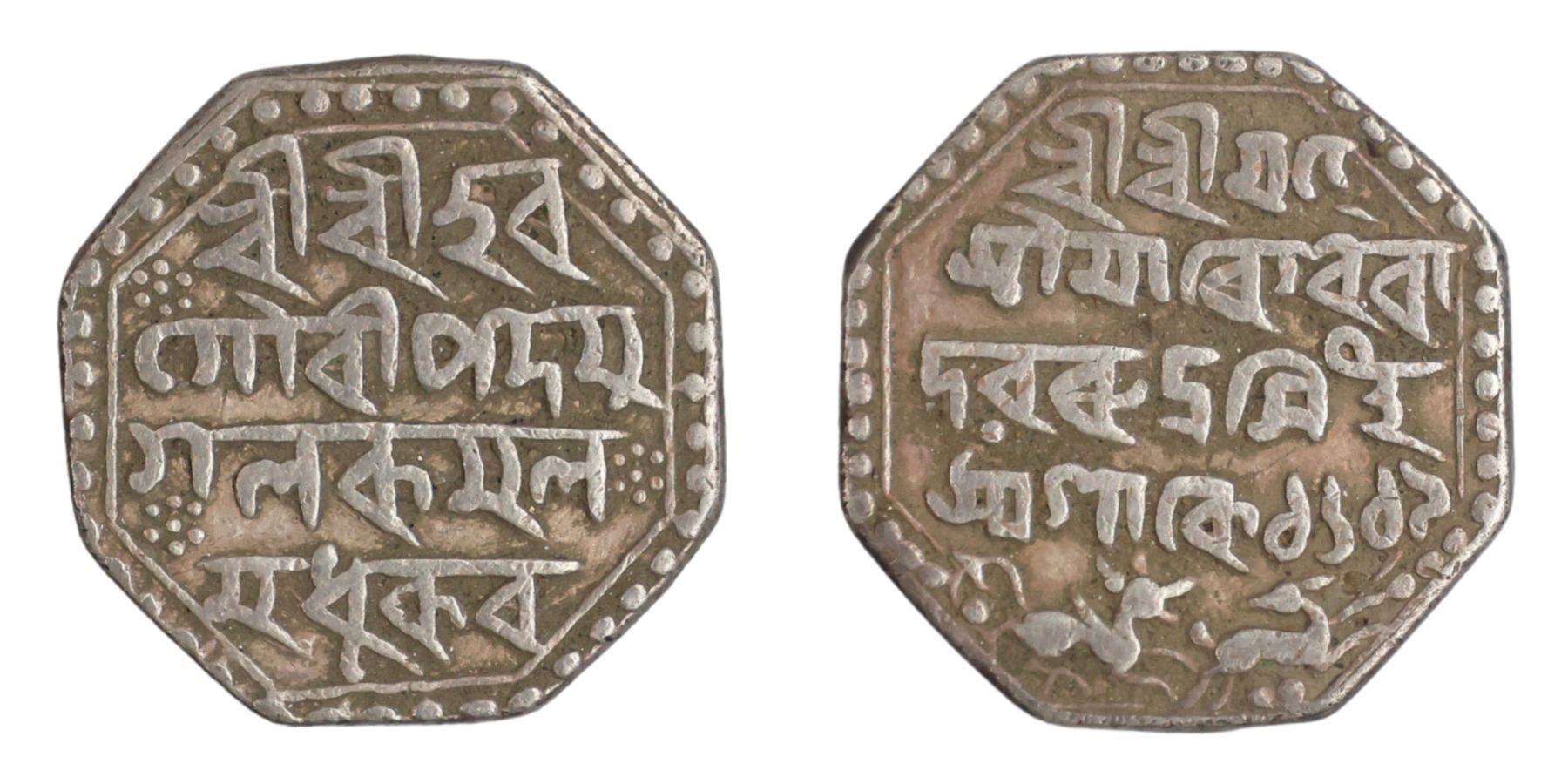 Assam, Rudra Simha (SE 1618–1636 / 1696–1714 AD), Octagonal Silver Rupee, SK 1619, 11.16g, 24.24mm. Assamese legends 4 lines each side. Obv: “Sri Sri Hara/Gauri Padayu/gala Kamala/Madhukaraâ€. Rev: “Sri Srimat/Saumesvara/deva Rudra Simha/sya Sake 1619â€. Lion chasing deer right. (RB F7.1, KM 41). Extremely Fine, Extremely Rare.Special coronation issue.