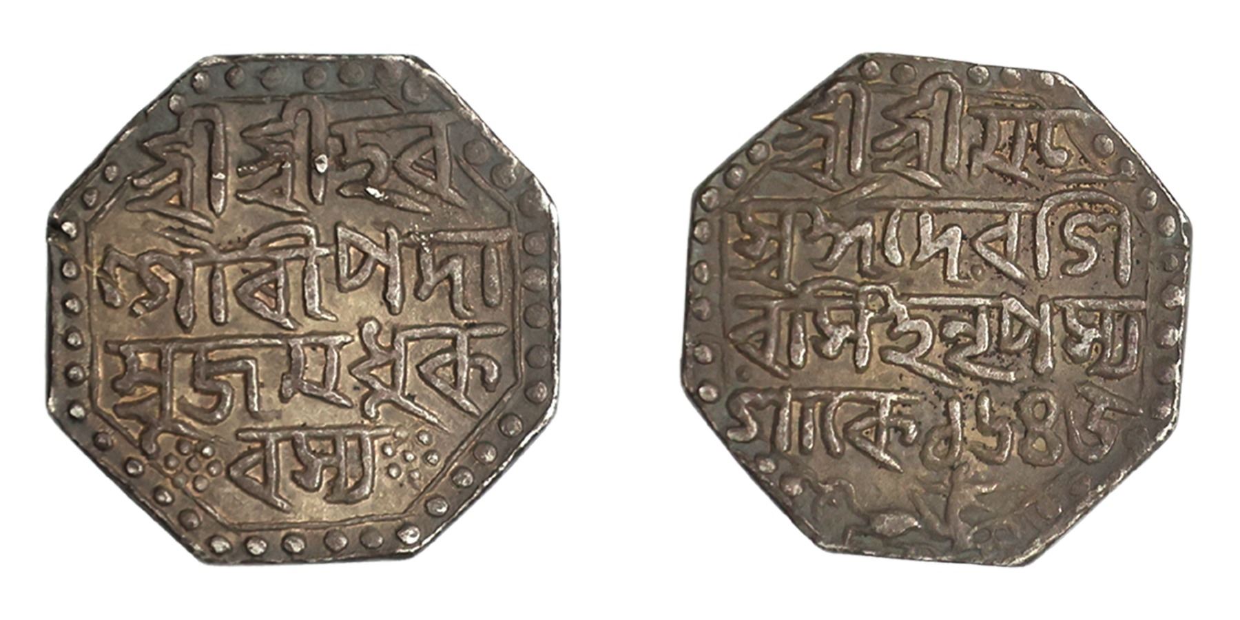 Assam, Siva Simha, Octagonal Silver Rupee, SK 1645, 11.48g, 24.15mm. Obv: “Sri Sri Hara/Gauri Pada/mbuja Madhuka/rasyaâ€. Rev: “Sri Srimat/Svarga Deva Si/va Simha Nrpasya/Sake 1645â€. Lion right. (RB G13.1, KM 51). Extremely Fine, Scarce.