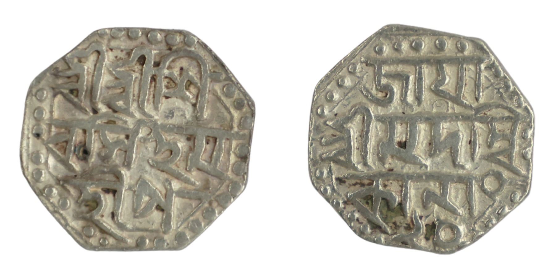 Assam, Siva Simha (SE 1636-1666 / 1714-1744 AD), citing Queen Ambika, Octagonal Silver Quarter Rupee, Year 20, 2.81g, 14.40mm, legends three lines on each side. Obv: 'Sri Sri Si/va Simha Ma/hipa', Rev: 'Jaya/ Srimad Ambi/kanam/ 20'. (RB# K21.1, KM# 85), Very Fine, Rare.