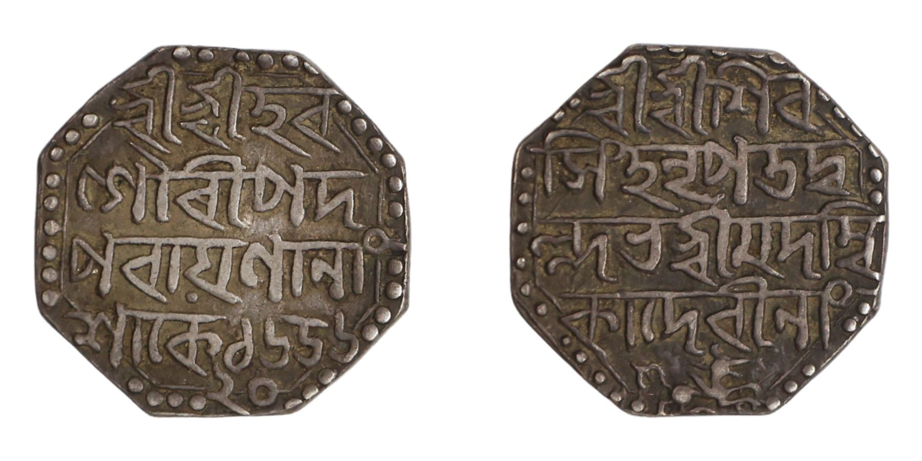 Assam, Siva Simha (SE 1636-1666 / 1714-1744 AD) citing Queen Ambika, Octagonal Silver Rupee, SK. 1656/20, 11.40g, 23.39mm, Assamese legends in four lines on each side. Obv: 'Sri Sri Hara/ Gauri Pada/ Parayananam/ Sake 1656 / 20'. Rev: 'Sri Sri Siva/ Simha Nrpa Tadva/llabha Srimad Ambi/ka Devinam', lion with tail down at bottom running to right, (RB# K9.2, KM# 91), Extremely Fine, Scarce.