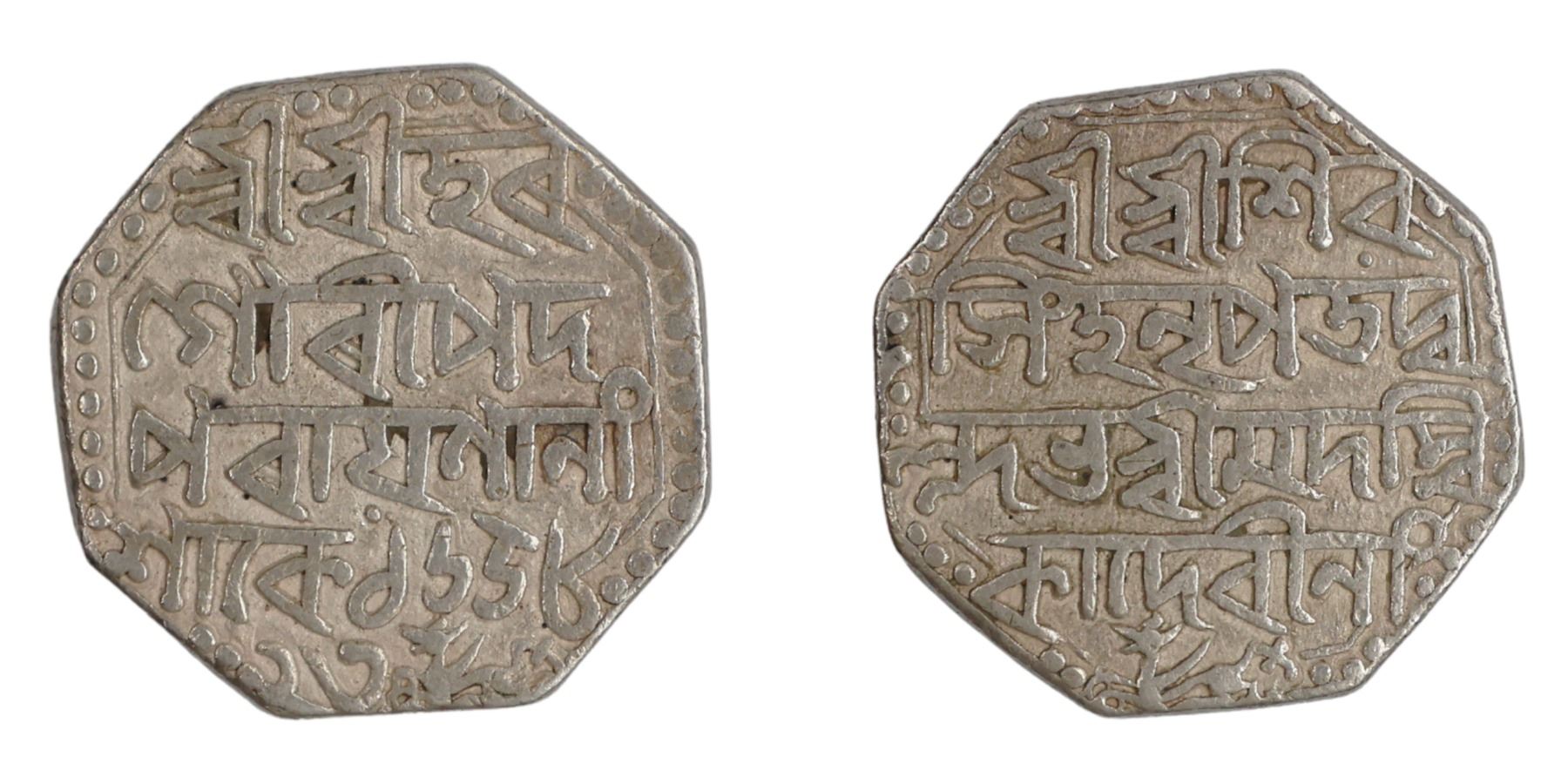 Assam, Siva Simha (SE 1636-1666 / 1714-1744 AD) citing Queen Ambika, Octagonal Silver Rupee, SK 1658/23, 11.40g, 23.86mm, Assamese legends in four lines on each side. Obv: 'Sri Sri Hara/ GauriPada/ Parayananam/ Sake 1658 / 23', lion with tail down at bottom running left, after the year. Rev: 'Sri Sri Siva/ Simha NrpaTadva/llabha Srimad Ambi/ka Devinam', lion with tail down at bottom running to left. (RB# K15.2, KM# 93), Extremely Fine, Scarce. The coin features a lion running in the exergue (bottom part of the coin) on both the obverse and reverse sides is extremely rare.