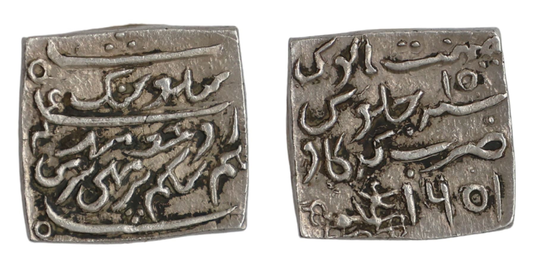 Assam, Shiva Simha (SE 1636-1666 / 1714-1744 AD), citing Queen Pramathesvari, Silver Square Rupee, Gargaon Mint, SK 1651, 11.41g, 18.52x11.49mm, legend in Persian script, Obv: 'Siva/ Singh Shah/ Sikkah/ zad chu mahr/ Bahm Begam Pramathesvari/ Shah', Rev: 'Maimanat manus/ sanah 15 jalus/ zarb gargaon 1651', Legends in persian 'struck at Gurgaon in 1651, the 15th year of the auspicious reign, with lion facing right at lower left, Reverse die without rotation unlike other assam coins. (RB# I14.1, KM# 75), Extremely Fine, Rare.