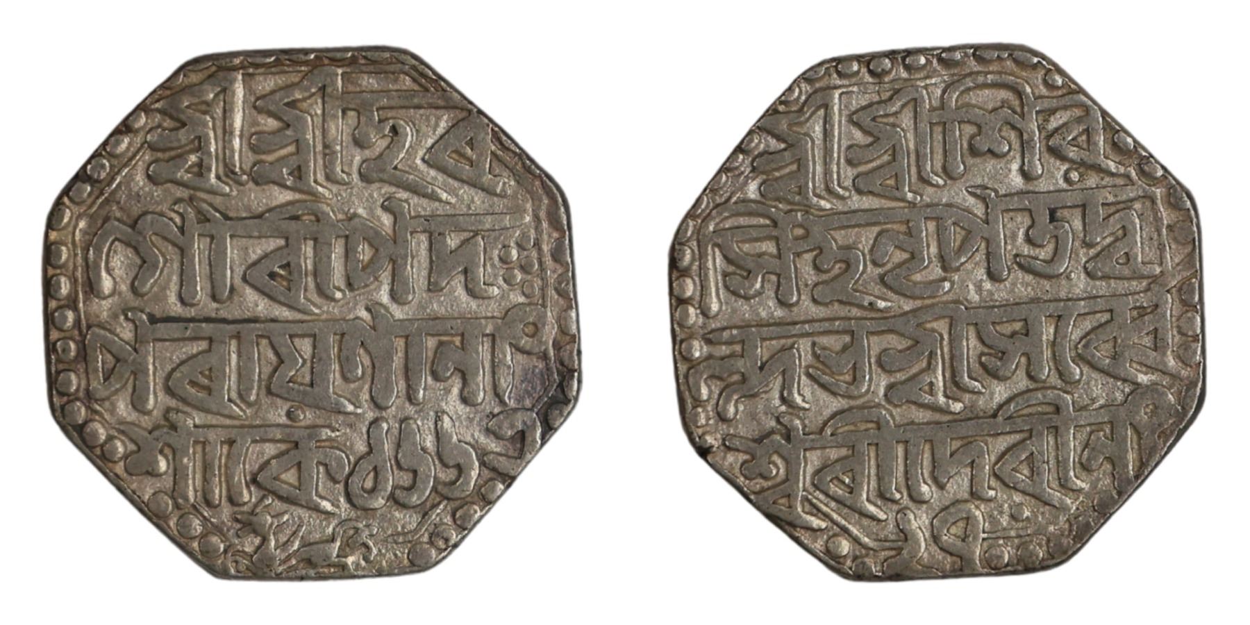 Assam, Siva Simha (SE 1636-1666 / 1714-1744 AD) citing Queen Sarvvesvari, Octagonal Silver Rupee, SK 1663/27 11.23g, 23.42mm, Assamese legends in four lines on each side. Obv: 'Sri Sri Hara/ Gauri Pada Pa/rayanayah/ Sake 1663'. Rev 'Sri Sri Siva/ Simha Nrpa Tadva/llabha Sri Sarvve/svari Devinam/ 27', Lion with tail down at bottom running to left. (RB# M9.1, KM# 112), Extremely Rare Date, Very Fine, Extremely Rare.