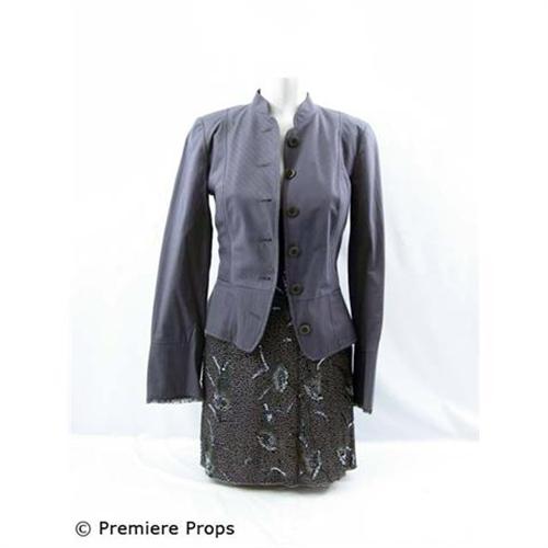 Assault on Precinct 13 - Unite and fight. Direct from the set of the crime thriller, this is Alex's (Maria Bello) screenworn hero costume. This costume features a lilac outer with grey sheer liner and shawl collar snap front coat, a medium grey self stripe with poplin waist "Tara Jamon" button up blazer, a silver grey beaded with mauve crepe lining zip up halter dress and black ankle wrap with metal studded stilleto heel "Stuart Weitzman" open toe pumps. Includes the original wardrobe tag! Make this key costume part of your movie memorabilia collection today! (AOP1013)
