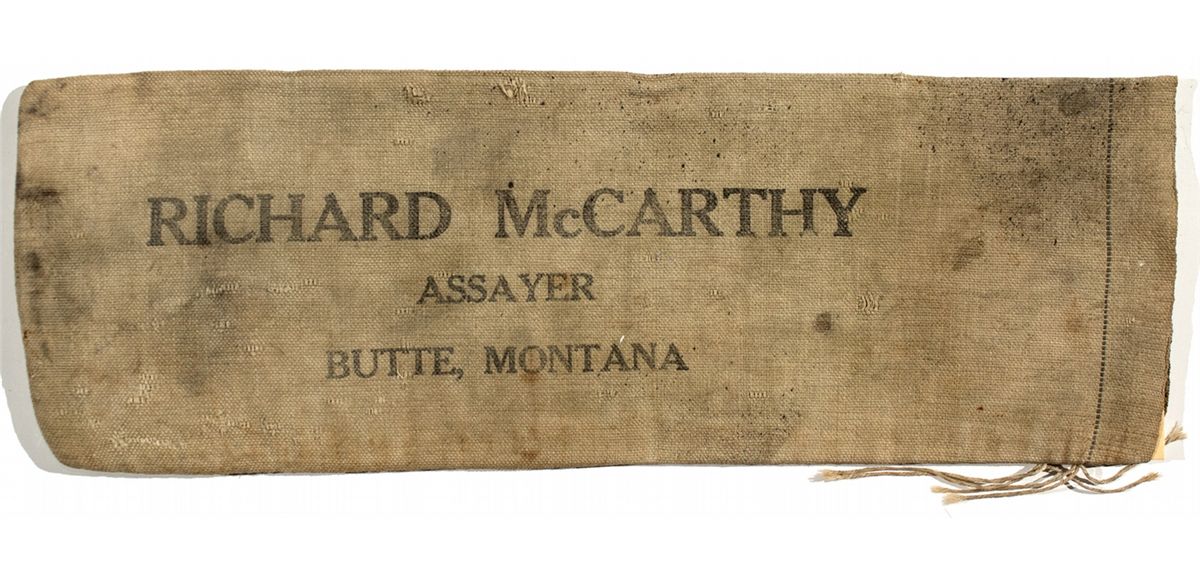 c1915 From Silver Bow County, Butte, MT. This tan canvas bag measures 14.5 x 5” and is stamped Richard McCarthy/ Assayer/ Butte, Montana. McCarthy was the manager of the firm Tout and McCarthy, Assayers and Chemists, who were active in the Butte District from at least the mid-teens to the 1930s, when McCarthy was noted in the Roundup Record Tribune (Roundup, MT, March 22, 1934) as the assayer of some ore samples from eastern Montana. The Mining and Scientific Press carried ads for the firm in 1916 and 1918. The Butte District was famed as the “Richest Hill on Earth” for its discoveries and subsequent mining of gold in 1864, silver in 1874, and of copper in the 1880s. Mining production has lasted for well over 100 years, with the heyday from 1882-1982. For the most part production was dominated by Anaconda MC. - HKA#65125