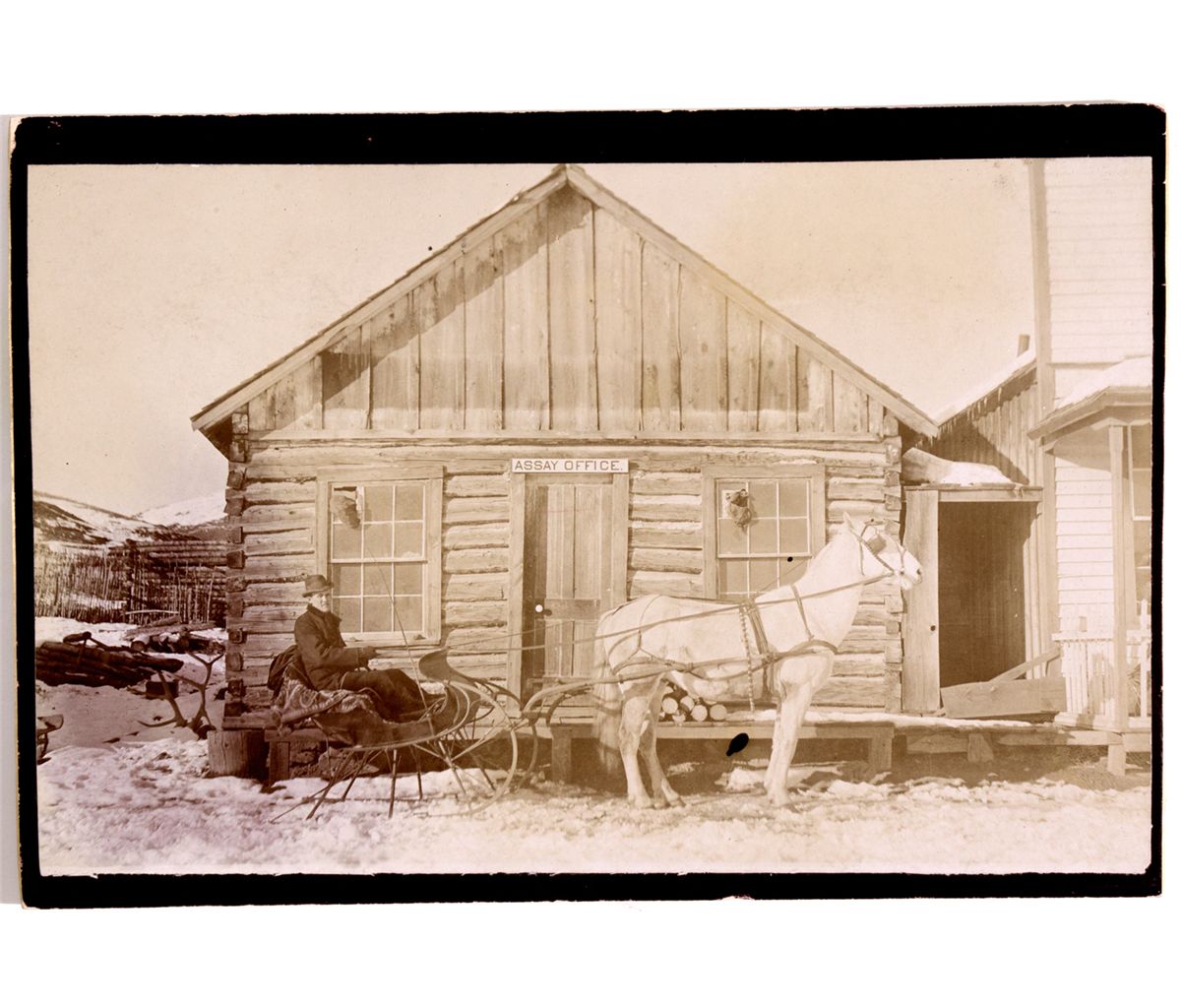Chas Moors and "Old Dick" pose in a sleigh in front of the Pony Assay Office, 7" x 4.25" good focus and contrast. - Mueller Collection -59091