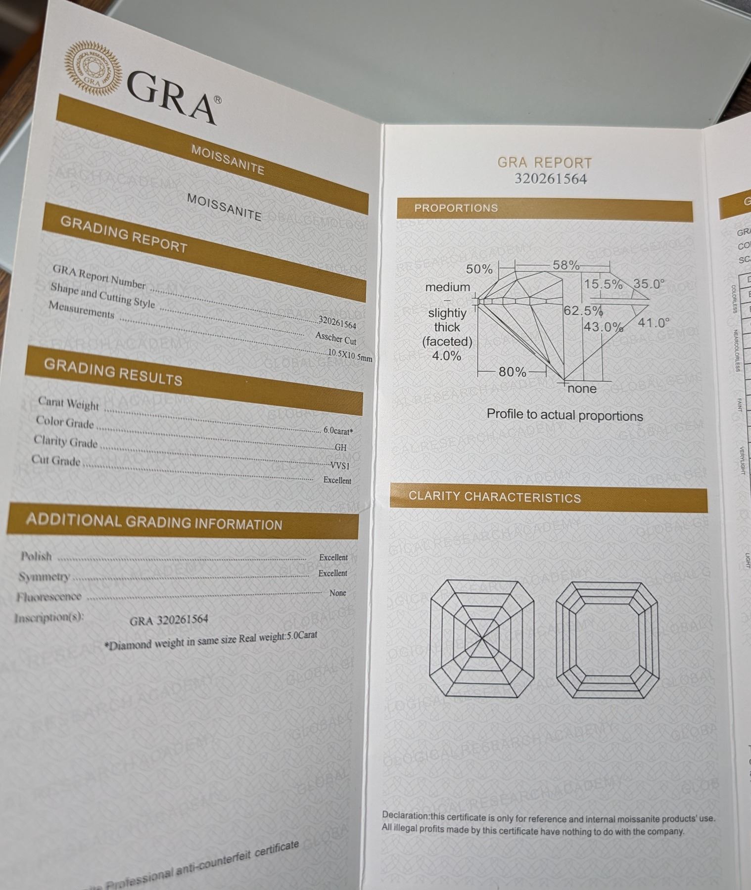 10.5x10.5mm Asscher cut Moissanite 6.0ct excellent cut - see GRA grading report