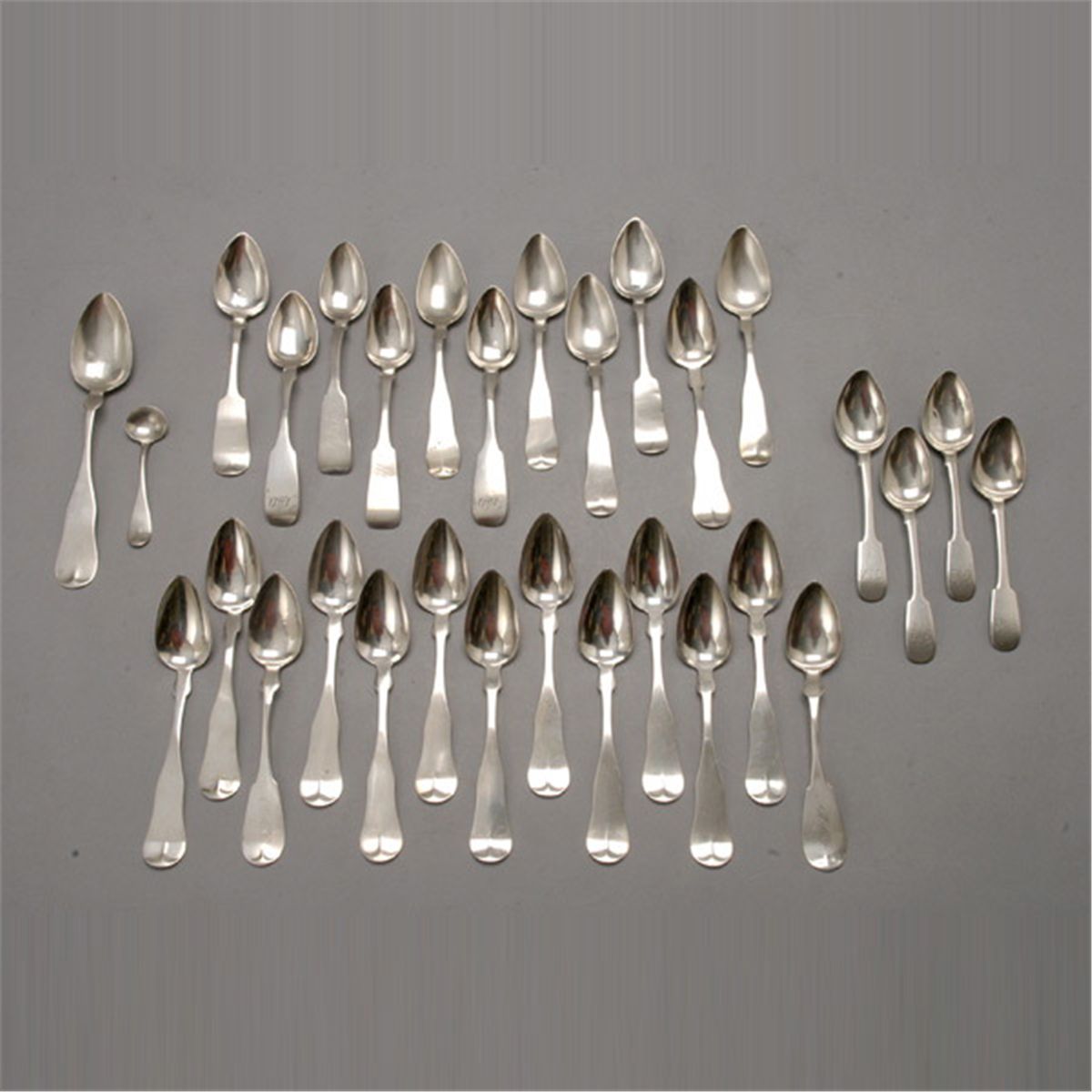 Assembled Group of Thirty English and American Coin Silver Spoons {Total silver weight 17.20 troy oz; average length 6 inches}