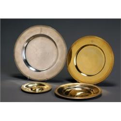 Consisting of six salad plates, 12 silver-gilt luncheon plates, 12 dinner plates and 18 silver-gilt saucers. Each with engraved palmette borders; salad and luncheon plates with engraved crown crest; dinner plates and saucer with engraved crowned F initial. Unmarked. 48 pieces.