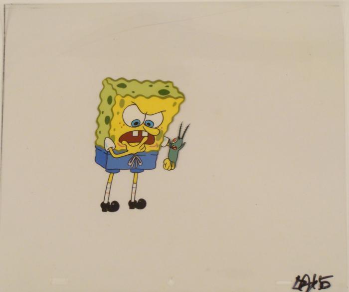 To create production cels, the original animator's drawing is transferred onto an acetate cel (by hand-inking and/or photo copying). The cel is then hand-painted on the reverse side. The cel is ready to be matted and framed. The animator's notations are at the bottom of the cel. The cel has multiple layers; first is Plankton and the second cel is SpongeBob