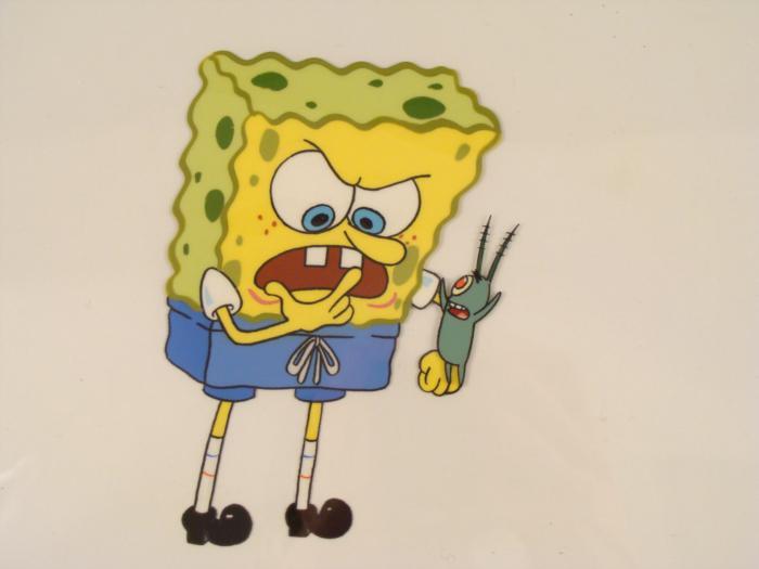 This original animation cel is from the Nickelodeon TV show SpongeBob Squarepants. The story takes place under the deep blue sea in Bikini Bottom, where SpongeBob resides. SpongeBob, who is a yellow, porous sponge, is your typical happy-go-lucky character, as he is always cheerful and enjoys making people laugh. Patrick Star, SpongeBob's neighbor who is a starfish, is your average children's show idiot, as he boasts knowing nothing and is often getting himself into ridiculous situations. Between the homes of these two lies the home of the miserable Squidward, a squid, who is known for being grouchy and playing tricks on SpongeBob and Patrick. Both SpongeBob and Squidward work at the Krusty Krab, a fast food business run by the greedy money-loving Mr. Krabs, a crab, the arch rival of the evil, possibly misunderstood, Plankton. Another neighbor, Sandy Cheeks, an athletic squirrel who normally wears an astronaut's space suit, was introduced in "Tea at the Treedome." She spends most of her time inventing and experimenting. Plankton is telling SpongeBob to be more assertive.Original Production Animated Cel Overall Size of Cel: 10 1/2" x 12 1/2" Very Good ConditionThis is an original hand-painted cel set-up used in the production of an episode of "SpongeBob SquarePants." Each one-of-a-kind set-up represents a slight change in position of the characters. When individually photographed and projected in rapid succession, the images appear to move.