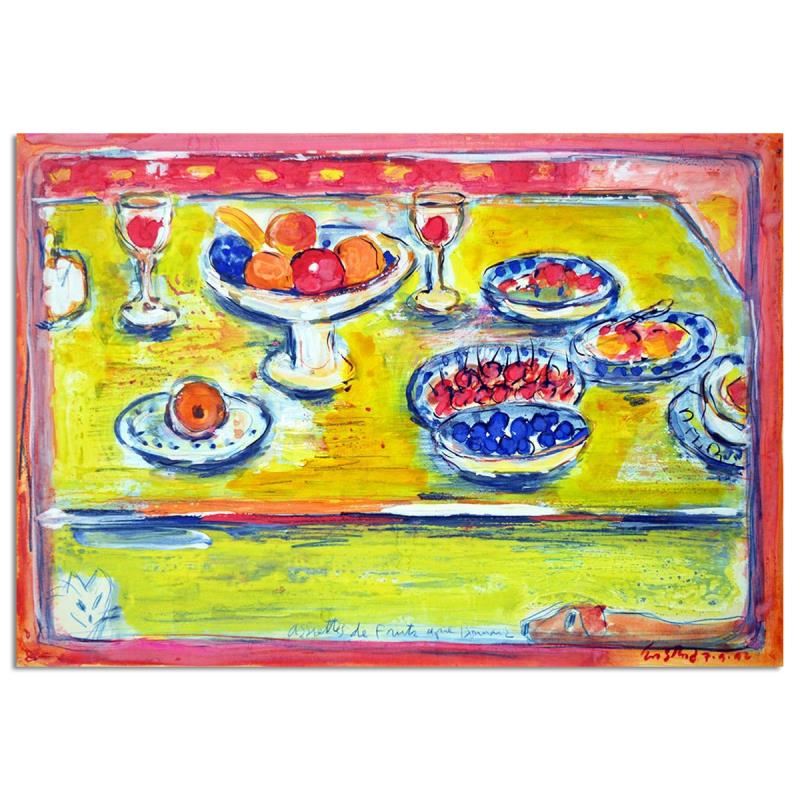 "Assiette Des Fruits" is an original Mixed Media on Board by Wayne Ensrud. The piece is hand signed by the artist and comes with a Certificate of Authenticity. Measures approximately 14" x 20".