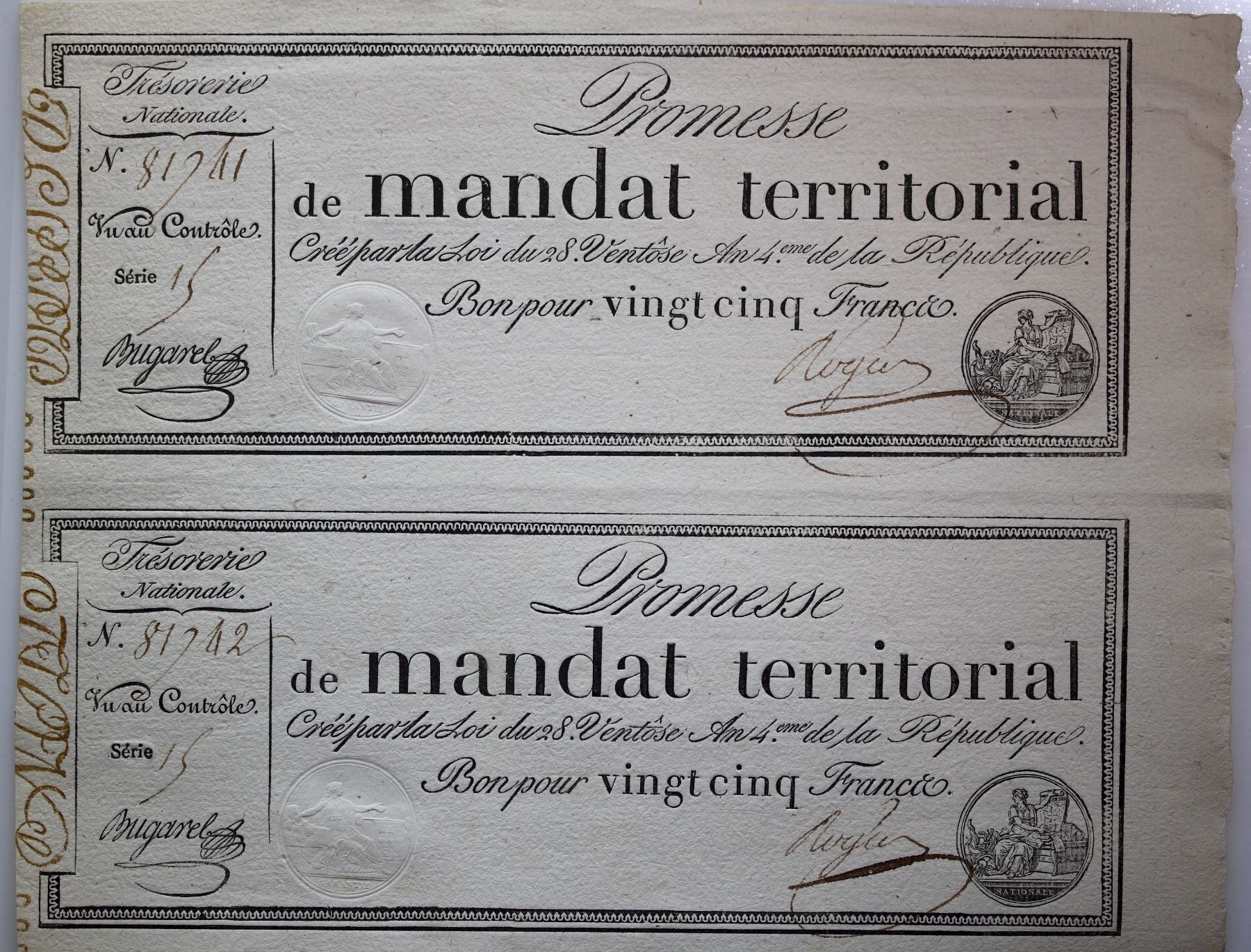 Assignat; Vintage French Colonial - Assignat -Promesse de Mandat Territorial - Bon de 25 francs. Sheet of 2 Uncut examples.