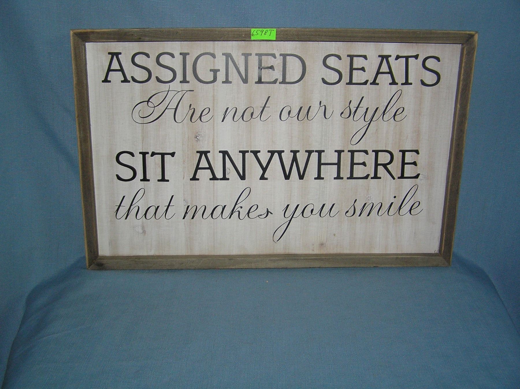 Assigned seats are not our style sit anywhere wood framed advertising sign est. value $50.00-$60.00
